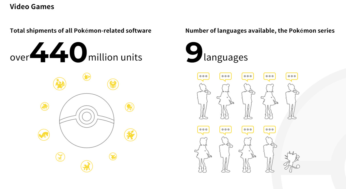 宝可梦系列游戏于1996年在日本推出,1998年登陆美国,有九种不同的语言版本。神奇宝贝TCG卡牌游戏同样于1996年在日本推出,1998年在美国发行,该卡牌游戏有13种语言,并在全球77个地区销售。此外,截至2022年3月,宝可梦系列动画已在全球192个地区播出,该系列动画于1997年在日本首播。