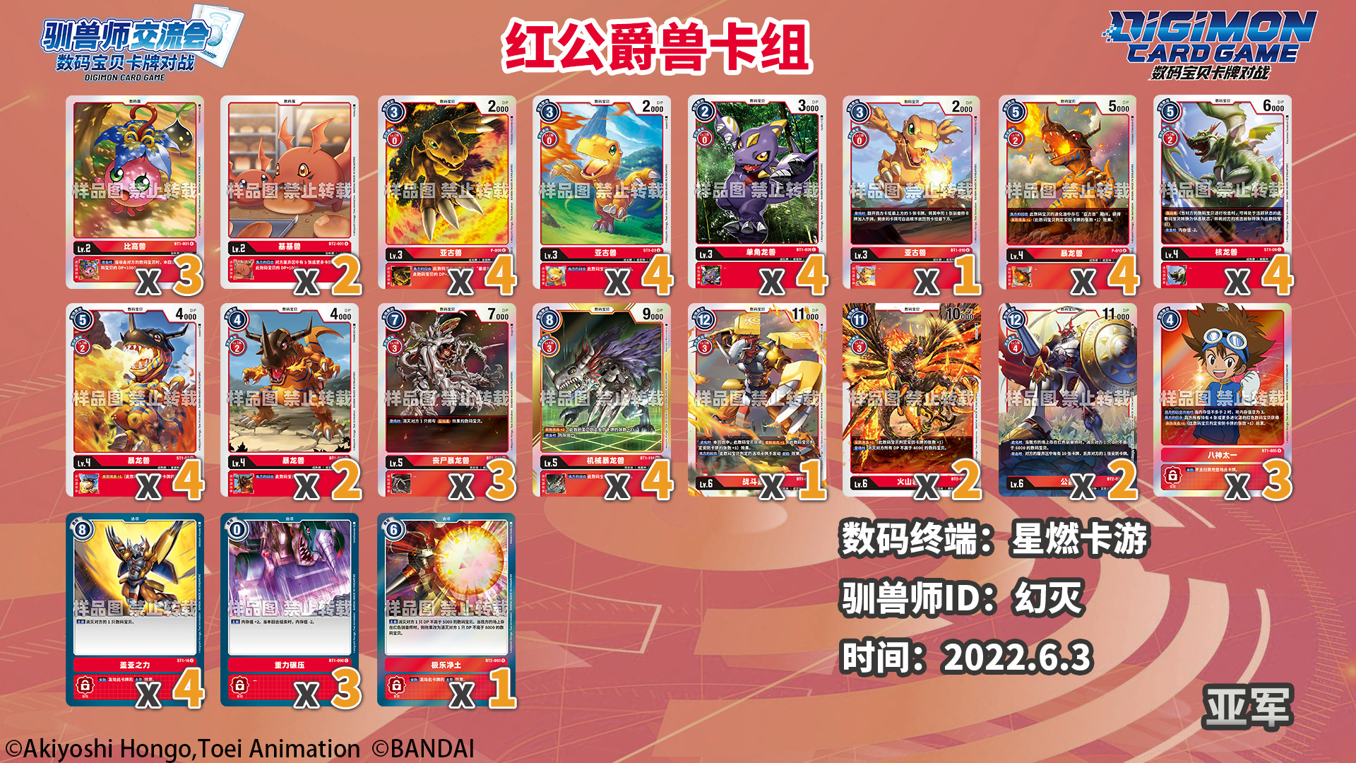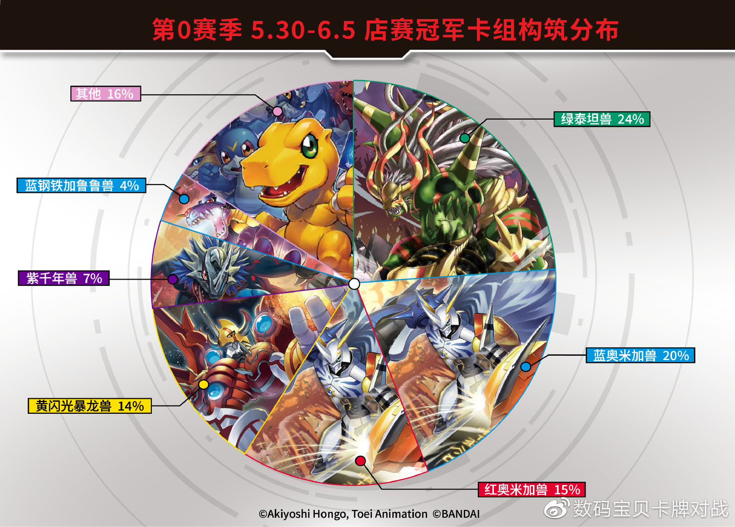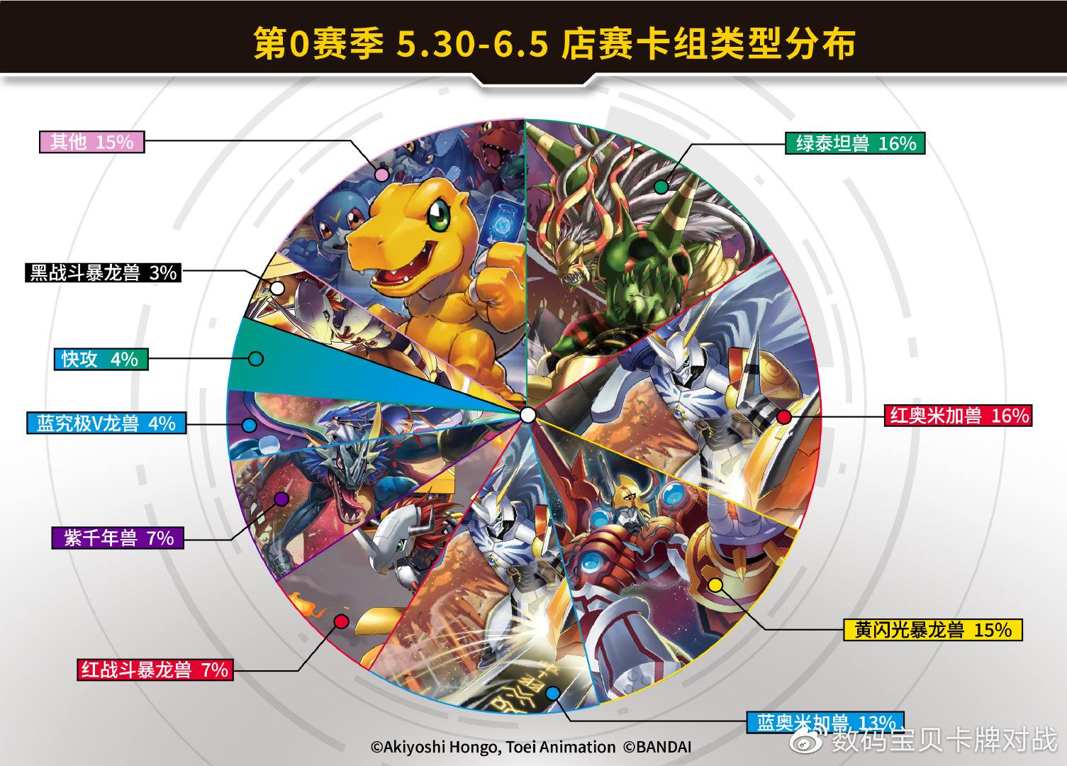 感谢各数码终端和驯兽师们为我们提供的数据及卡组照片!以下数据仅供各位参考!因收到的卡组照片可能会有模糊不清的状况,展示的卡组可能与实际构筑有所出入。对本次统计如有疑问和建议欢迎以转发/评论/私信等方式联系我们!