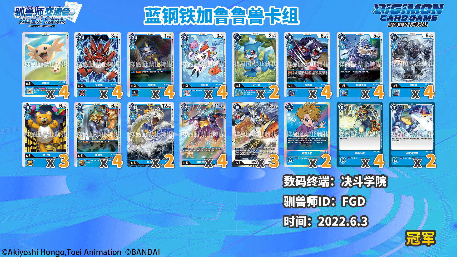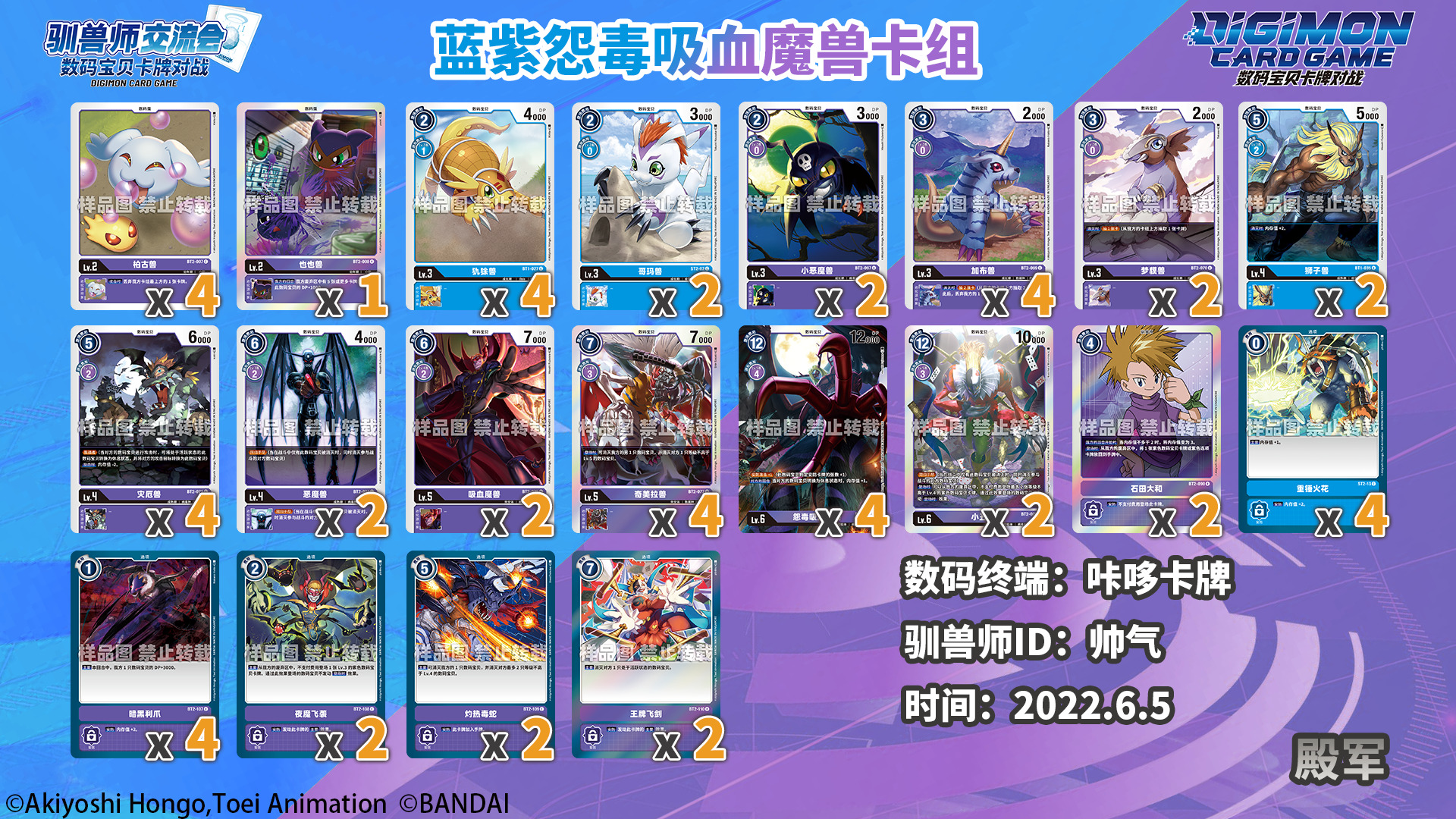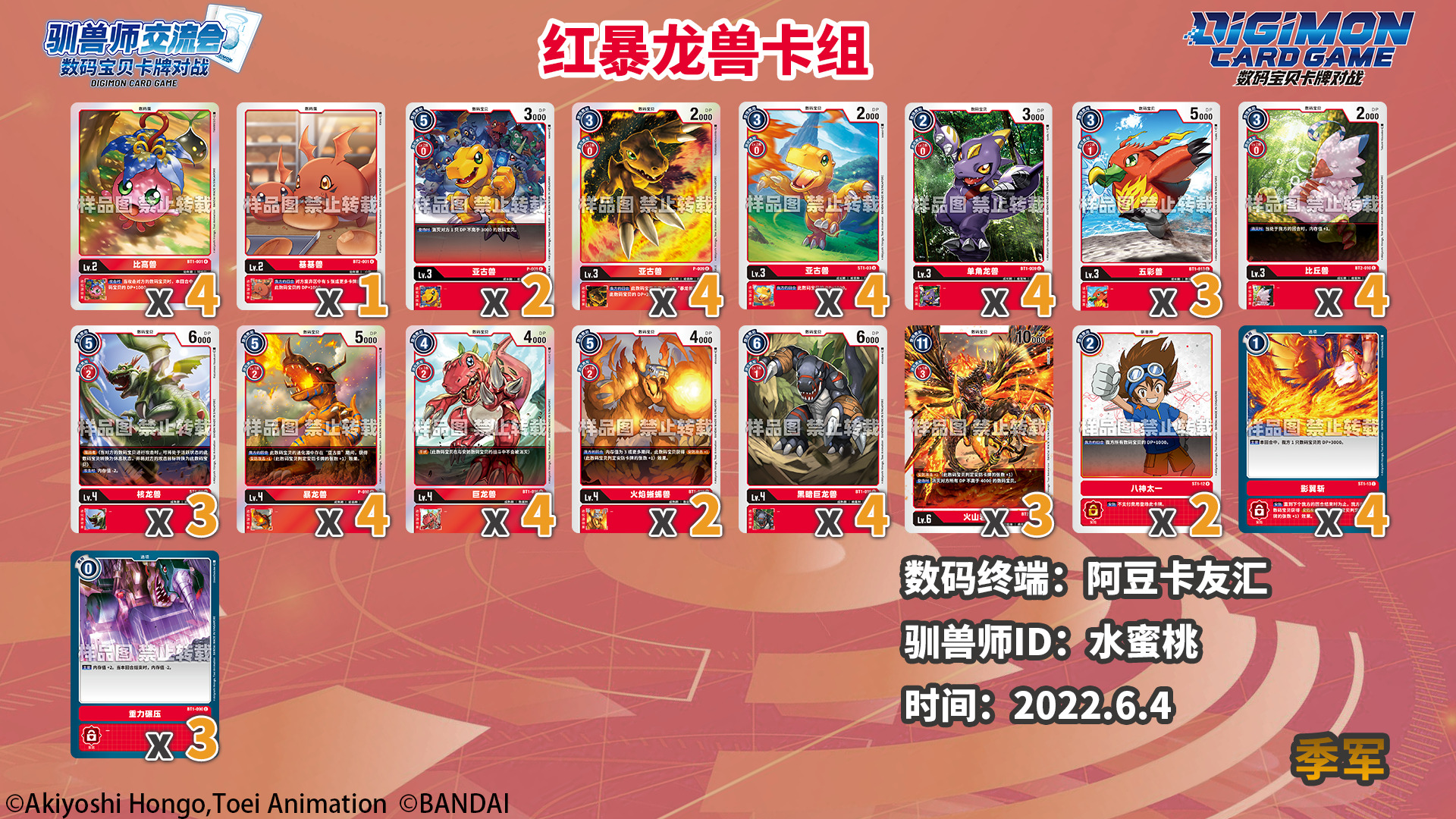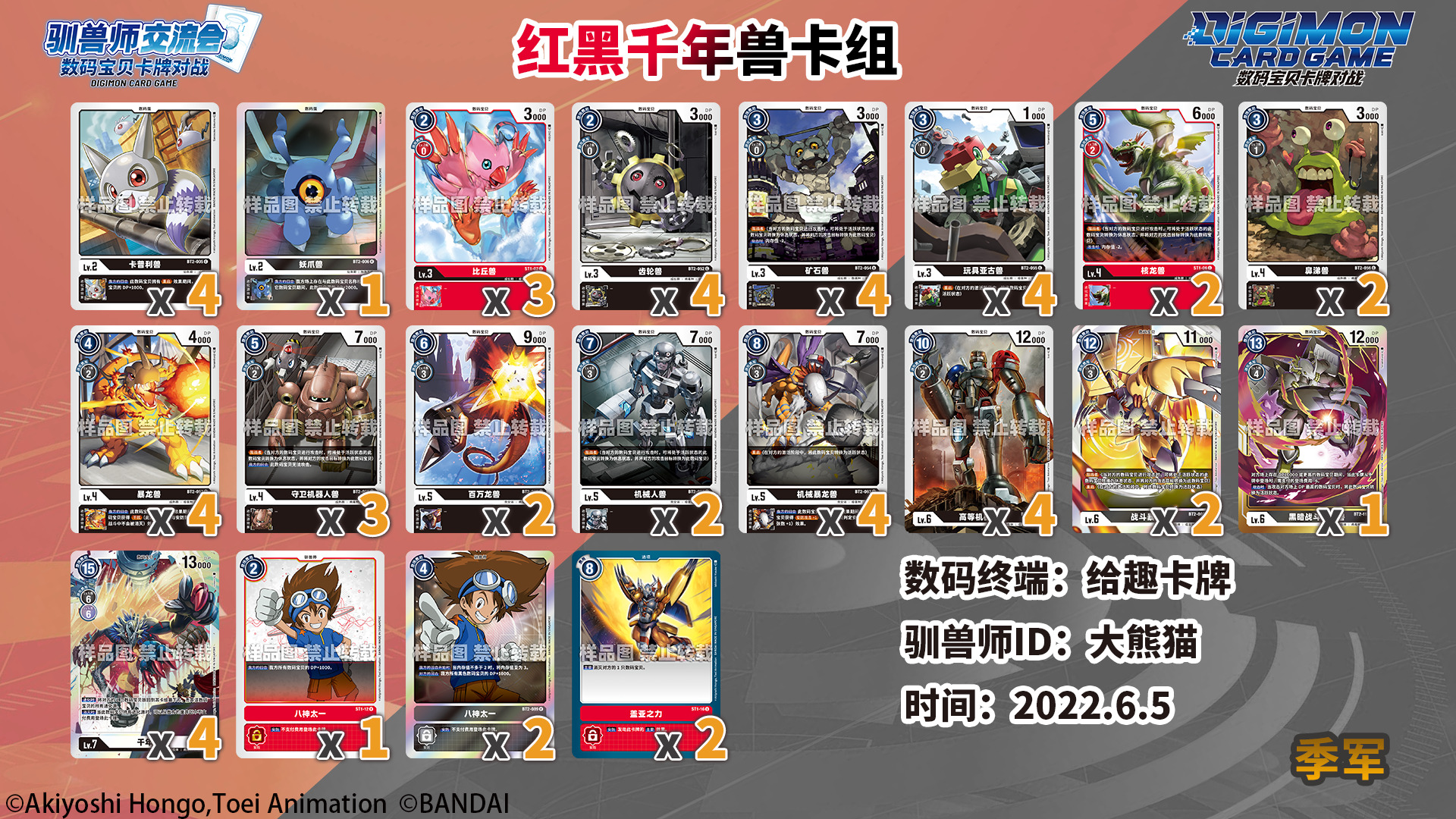 感谢各数码终端和驯兽师们为我们提供的数据及卡组照片!以下数据仅供各位参考!因收到的卡组照片可能会有模糊不清的状况,展示的卡组可能与实际构筑有所出入。对本次统计如有疑问和建议欢迎以转发/评论/私信等方式联系我们!