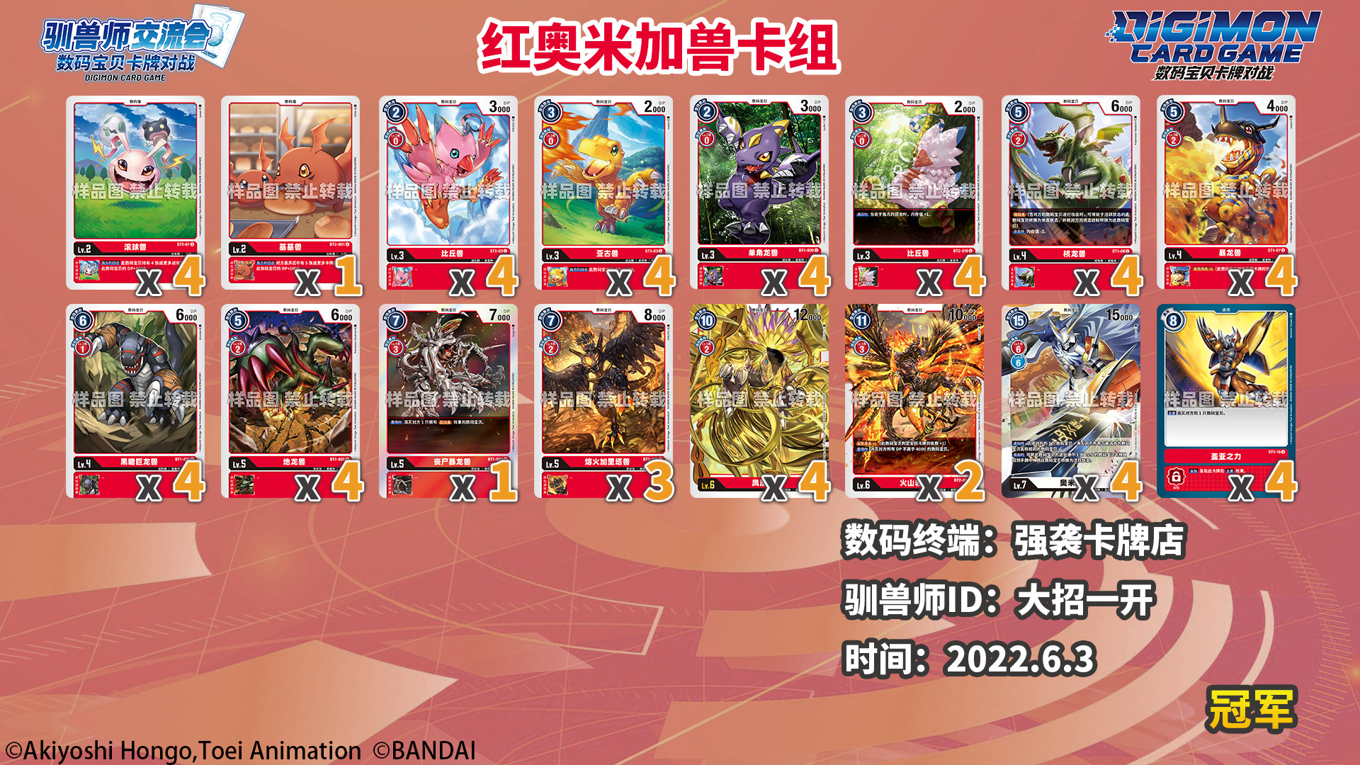 “大招一开”选手使用红奥米加兽卡组在佛山强袭卡牌店6月3日的31人比赛中夺得冠军,本次上位卡组类型分布统计中,共统计到了53套该类型卡组,使用率16%。冠军卡组构筑分布中统计到了13套该类型卡组,占比15%。
