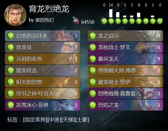 龙之启示、激奏火神龙(烈焰之龙)都可以在前期快速跳费,屠龙骑士·罗伊也能在前期跳费后在第4回合登场,帮助这套牌在第5回合抵达觉醒。觉醒后的烈绝龙可以触发很多组件的额外效果——暴戾龙人能高效抢血,还可以进化过墙;罗文制造的黑龙的诅咒能以不消耗费用的方式持续制造伤害;烈绝的崇拜者、育龙员、猎龙砍击也都可以辅助抢血。