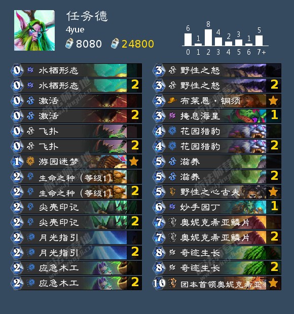 hello大家好,我是4yue,是一个喜欢尝试冷门卡组的标准玩家。平时分段大致在钻石至传说分段。今天给大家带来一套任务德(我之前在营地上抄的)的攻略,我在补丁前以45局64%的胜率用这套卡组打上传说。由于天敌恶魔猎手的削弱,补丁后这套卡组应该会更适合于环境。推荐给喜欢尝试非主流卡组的玩家~