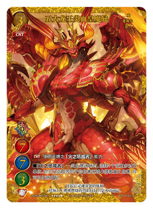 第一弹的封面怪兽[五大龙王炎血皇魔异],等级3的怪兽身板为标准的773,再次基础上还有进场时可以给予对方单位自己伤害数量的卡的解场效果的传奇卡。其最大的优势在于效果并非TD或者OD而是只要进场就可以发动,也就是说可以被第一弹福尔纳的主题之一【创生召唤】从卡组特殊召唤出来后发动效果。运气不好在游戏前期发动cnt的话能造成的伤害比较低会比较尴尬,