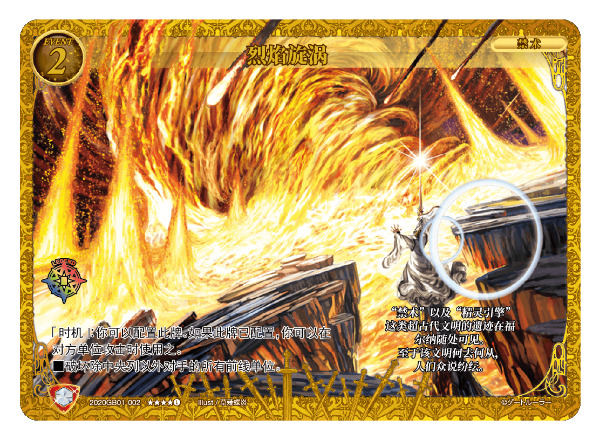 第二张同样是福尔纳的传奇卡[烈焰旋涡],对方单位攻击时可以破坏除了中央区之外对手所有的前线单位的效果不禁的让人联想到游戏王中的某张崇高力量。可以做到相对来说比较安定的1换2,并且阻止对方的攻击,确实不辱传奇卡之名。没有cnt效果本身并不能算是缺点,但是在没有能够精确检索和回收的方法的情况下投入1需要让人思考成功使用的概率。