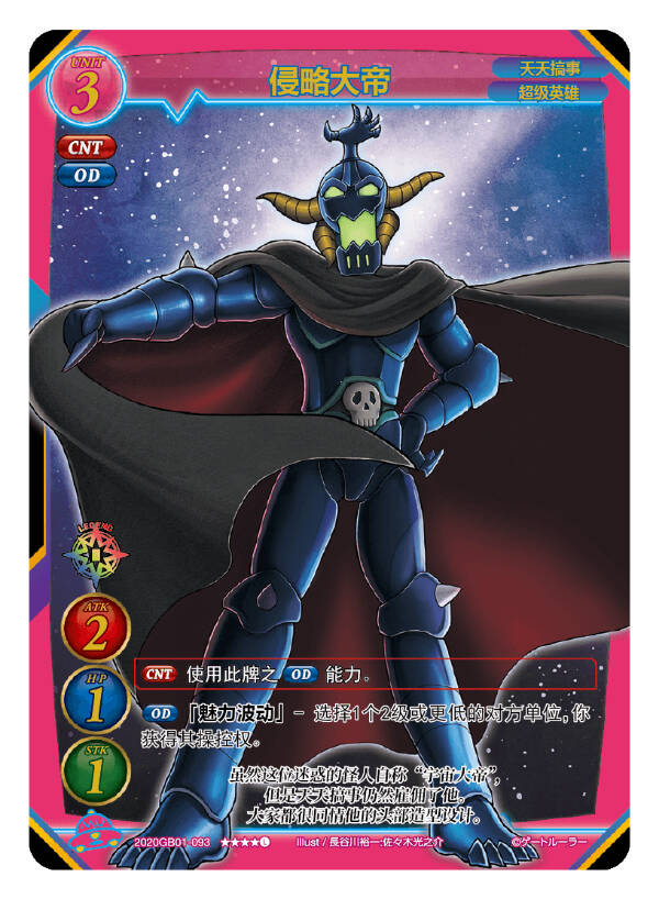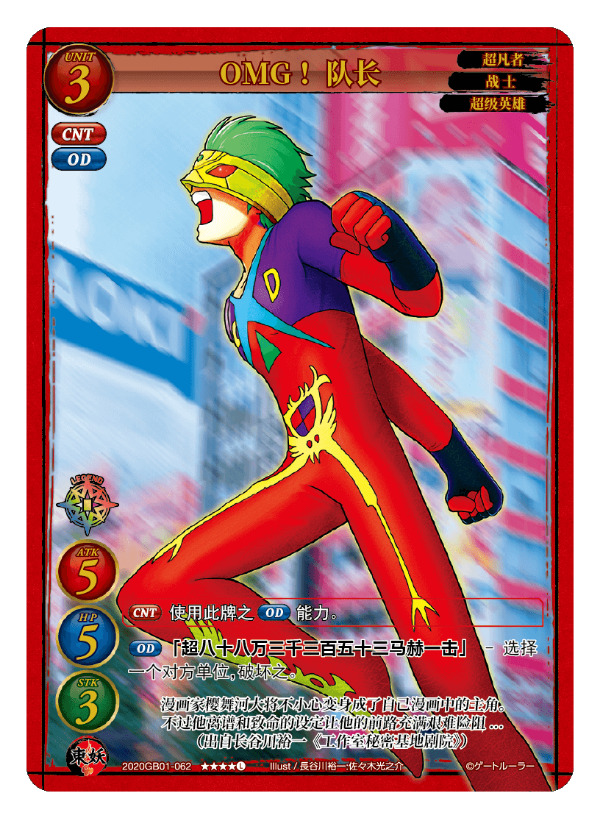 东妖军的传奇卡[OMG队长],和本次惊奇宇宙的[侵略大帝]一样出自长谷川裕一老师的漫画,而并非门将的原创怪兽。效果也是十分的简单粗暴,但是作为牺牲ATK和HP都只有5,等级3的卡片的基础数值应该为773或者664,可以看出OD破坏对方1个单位的卡占据了相当的身板,简单粗暴。虽然属性带有战士,但是OD能力在特殊召唤的时候并没有办法发动,所以也无法用创生召唤来出。总的来说是个人感觉相对来说比较残念的一张传奇卡。