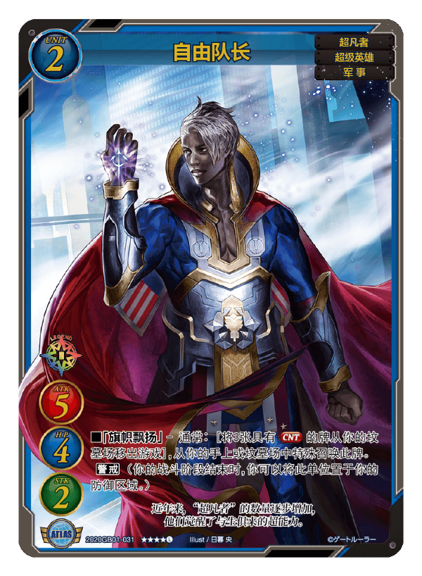 同为阿特拉斯军的狂象仅在登场到下个自己的回合的1回合间才拥有452的身板和警戒,而自由队长在同一数值下甚至拥有自我复苏的能力,足以体现他作为传奇卡的强力。让他不管是进攻还是防守都十分灵活,作为骑士真正的第三选项而存在。选择了ATLAS势力的童鞋就当被骗了,一定要试试自由队长。