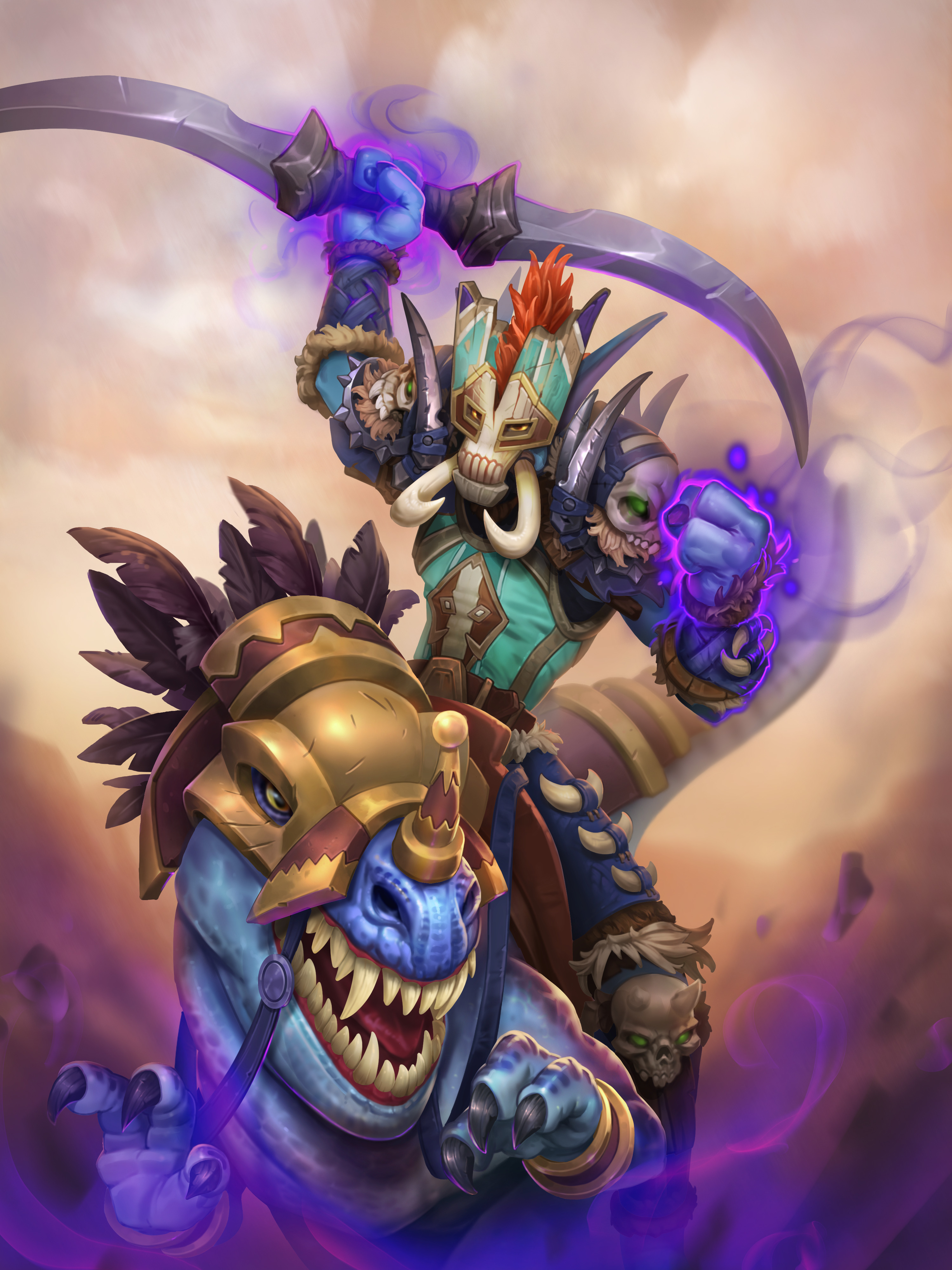 这一套是巫妖被加强后再研究的阵容,通过伊利斯雷诺的探险队和变装暗影队结合,放弃了卡扎希尔瓦娜斯的终结手段。因为雷诺每次随机的技能都是不一样的,而这套伤害前期输出不是很够,加上相同的对局都会有很多不同情况,所以这套熟练度要求比较高,但也更加好玩(挖宝出猴子真的很爽)。