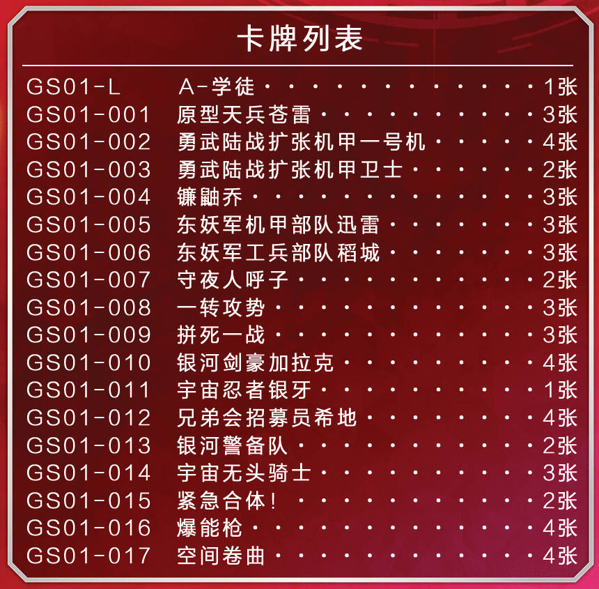 本预组套牌共含有51张卡牌,一张中文说明书,其中【守夜人呼子】和【镰鼬乔】各提供闪卡版本一张。预售期间购买还会获得PR卡【龙魂机甲关云长】。