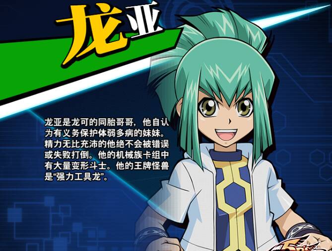 龙亚是游戏王5DS双子中的哥哥,使用以机械族为主的变形斗士卡组。在动画中的决斗戏份不是很多,且有2场都是组队决斗。本身是继承了在5000年前与地缚神对抗的生命激流龙的龙印者。但是因为伊利亚斯特尔的穿越时空导致时间线发生了变化,生命激流龙被黑翼龙取代。在和阿波利亚的决斗中觉醒成为龙印者,他的王牌怪兽强力工具龙也进化为生命激流龙。在结尾成为了拥有和游星、杰克和乌鸦同样实力的骑乘决斗者,不过依旧会送妹妹上学。