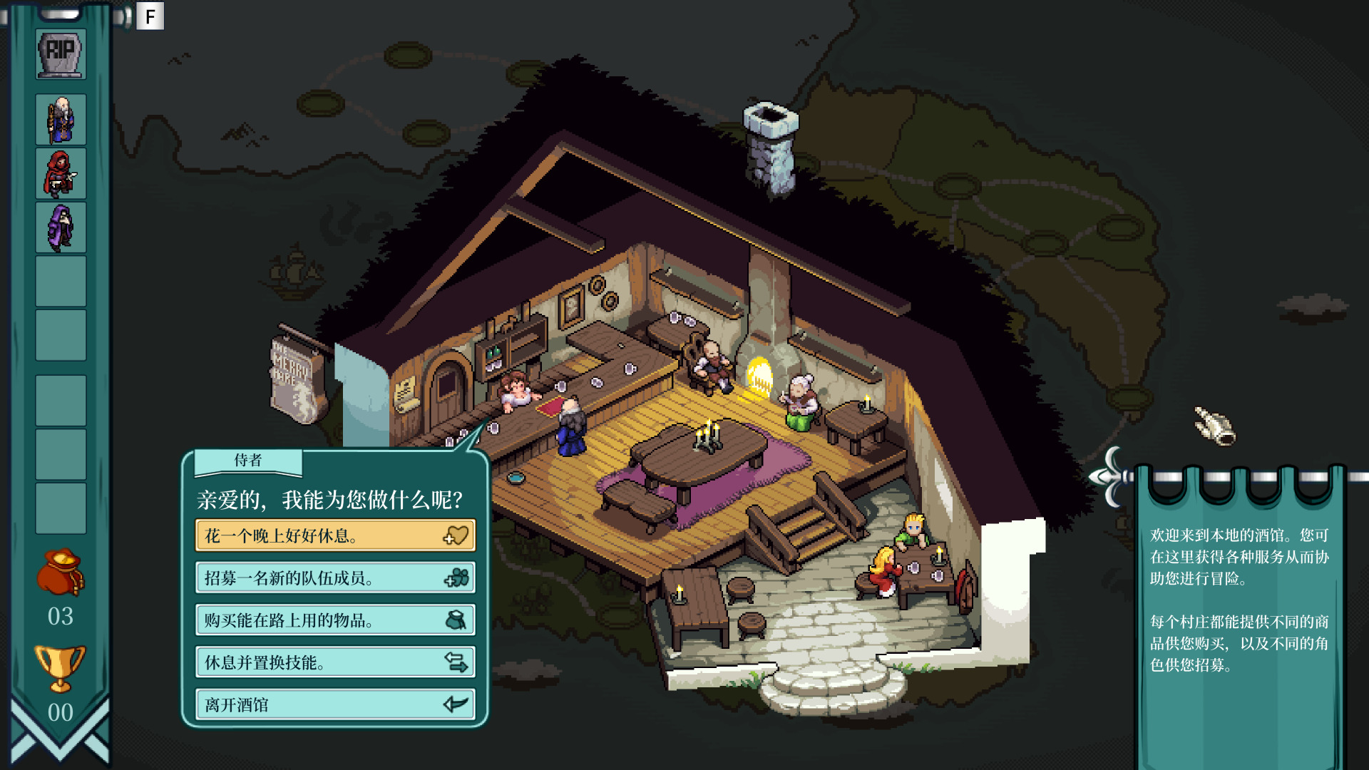 但仅此而已,目前能提供的肉鸽元素少之又少,因为本作的基础就没有任何的养成要素,旅馆的功能也只是休息换队员和重新随技能,没有任何能够吸引玩家继续游玩的内容。