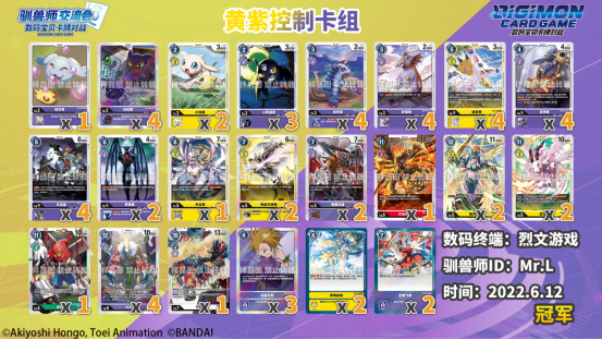 “Mr.L”选手使用黄紫控制卡组在天津烈文游戏6月12日的18人比赛中夺得冠军,本次上位卡组类型分布统计中,共统计到了4套该类型卡组,属于其它板块。冠军卡组构筑分布中统计到了2套该类型卡组,占比2%。