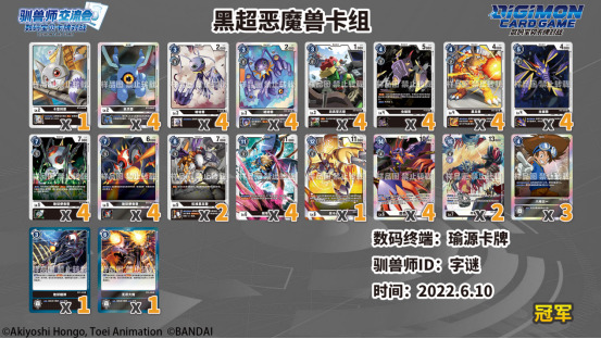 “字谜”选手使用黑超恶魔兽卡组在瑜源卡牌 6月10日的7人比赛中获得冠军,本次上位卡组类型分布统计中,共统计到了2套该类型卡组,属于其它板块。 冠军卡组构筑分布中统计到了2套该类型卡组,占比2%。