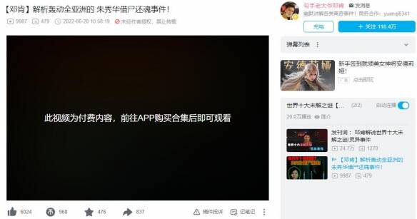 今日,B站推出“付费视频”功能试点,需使用手机客户端进行购买后才可观看。已知仅有百万粉的搞笑up主“勾手老大爷邓肯”的视频“世界十大未解之谜”合集的P2正片部分需要付费。目前用户只能通过手机客户端,网页端也必须强制使用手机客户端付费后才能进行观看,目前该付费视频售价30元。