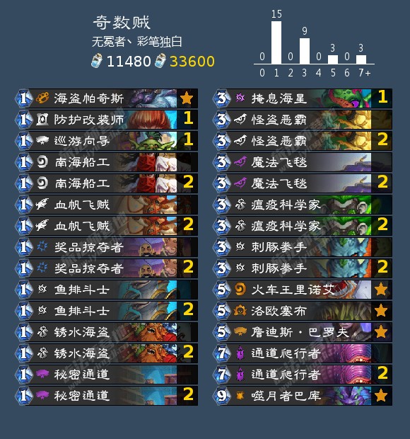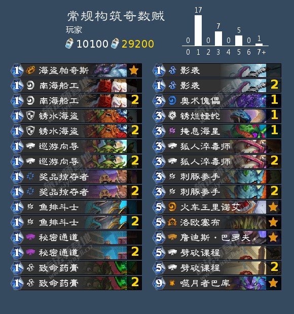 不同于现环境的奇数贼,这套卡组放弃了致命药膏和狐人淬毒师等进攻牌,而是带上了魔法飞毯和怪盗恶霸这种防守配合。通道爬行者一卡以及各类低费随从,配合剧毒刺豚拳手的天地反的操作,也能在中后期进行一次小返场。可以看出这套奇数贼整体的节奏中心在后期,放弃进攻转向防守在如今环境倒也是一种独特的选择。