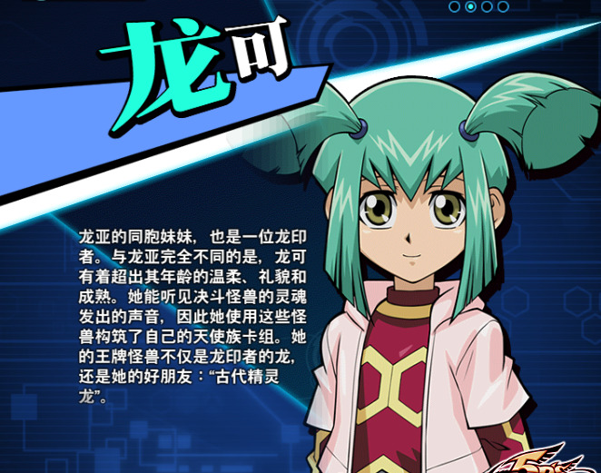 龙可是5DS双子中的妹妹,能听到决斗怪兽的灵魂的声音。在小时候某次生病使其灵魂进入了精灵界,并与古代妖精龙达成了约定会去拯救精灵界。虽然在幸运杯就觉醒了龙印但是她当时并没有获得古代妖精龙,在暗印者篇中前往精灵界解救了古代妖精龙之后和龙亚一起击败了猴地缚神。后续的决斗戏份很少,在弧线摇篮中和杰克、龙亚一起对战阿波利亚。在动画结尾去读了大学。