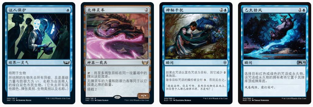 备牌方面,新卡佩纳为我们带来了去除:证人保护,这张限制都不太厉害的去除却为这套牌补强了很多,1费结界抹异能,既解决阻挡者和功能生物,也能够激活游魂幽笼的减费。同时因为新卡佩纳的补强还有无牌灵车,这张牌已经成为了所有生物套牌针对坟场的备牌。高效的颜色针对乙太劲风、神秘干扰都是不错的选择,尤其是神秘干扰,还是那句话,1费对这套牌太关键了。最后的卡位可以根据环境而定,生物套牌多就使用摄魂旋律/受惑欧理可,相反则可以使用倨傲击或者更多的反击/保护咒语。