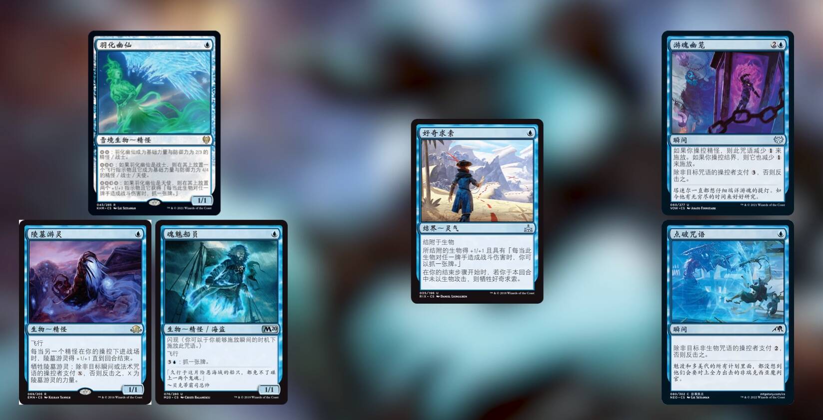 除了雷打不动的4*6 24个生物,满编的关键咒语游魂幽笼+好奇求索,23个地,我们大概只有五个卡位是活动的,其中1-2张留给厚颜借物灵和幽魂仇敌,增加干扰型闪现生物的数量,非生物咒语则可以选低费互动点破咒语、渐失希望,保护类咒语悄声离开都是可以接受的选择。