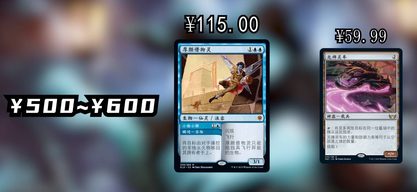 均以淘宝最低价格计算,该套牌百元以上单卡仅有一张厚颜借物灵,在此套牌中使用1-2张,而超过50元的单卡也只有备牌的三张无牌灵车,全套牌价格共计500-600元,而刚刚说的两张牌便占了这个数字其中的一半:也就是说,在新卡佩纳上市前,这套牌的价格甚至仅需400元左右。