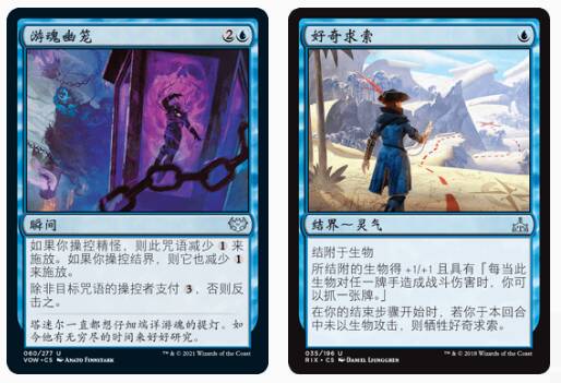 好奇求索+游魂幽笼可以说是套牌的主计划,只要好奇贴在飞行精怪上,踢中就能抓牌,这时游魂幽笼便只需要一费便能施放,在这种节奏套牌留1费过还是2费简直是天壤之别,这也是清高拒斥如此符合套牌属性,却很少有纯蓝精怪使用复数张它的原因,就因为它无论如何也要两费。