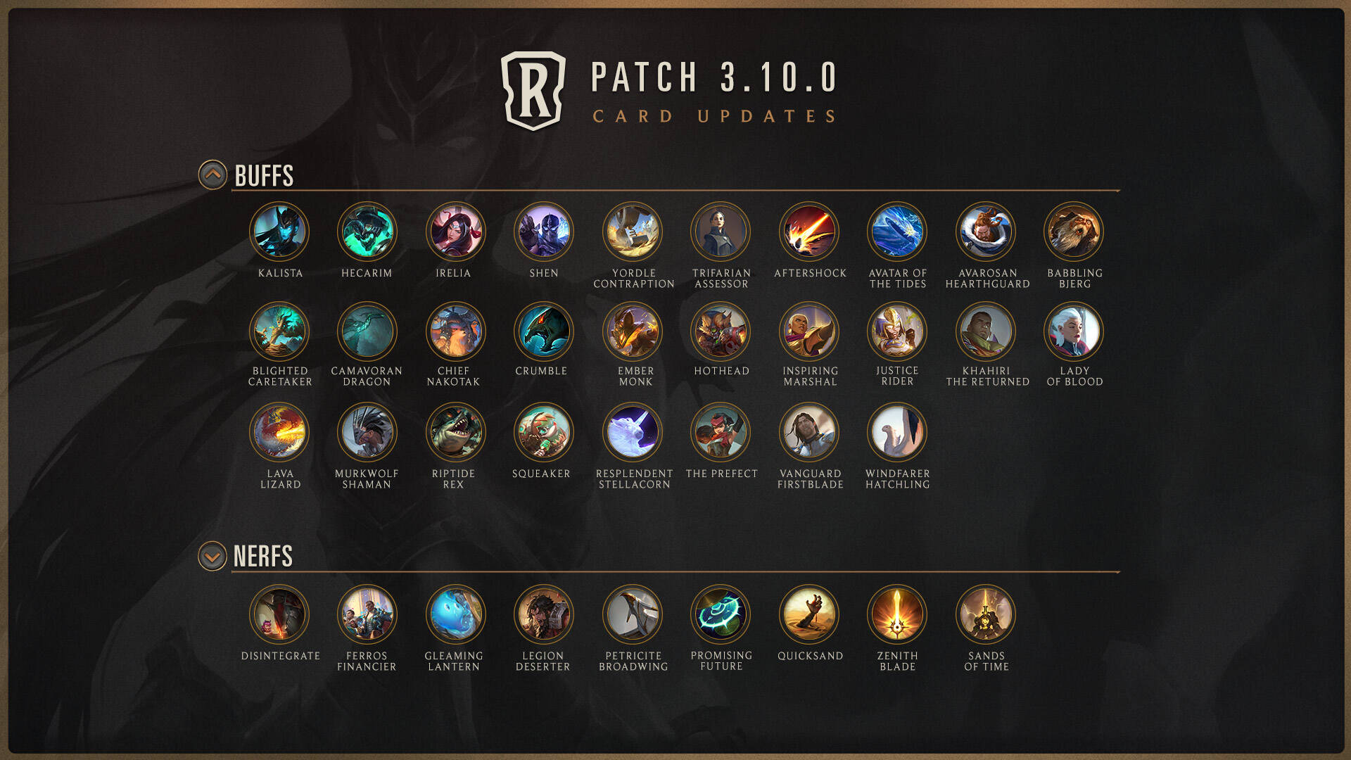 LoR的3.10版本将于6月29日凌晨发布完整的更新说明,涉及40多张卡牌的调整。