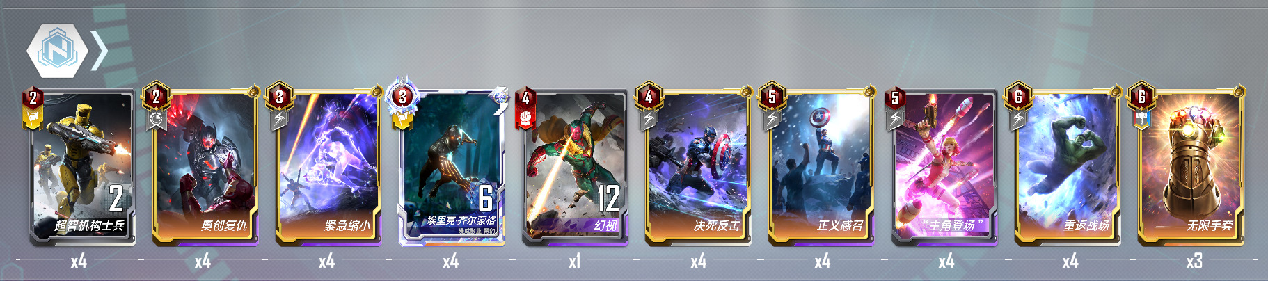 P.S 如果想要上分的卡组,可以浏览我上赛季写的【四败复联死侍】,当前环境下可用并且非常强力,比赛中成绩也比较好。如果环境中索尔终幕较多,3费可以换成死侍2099。