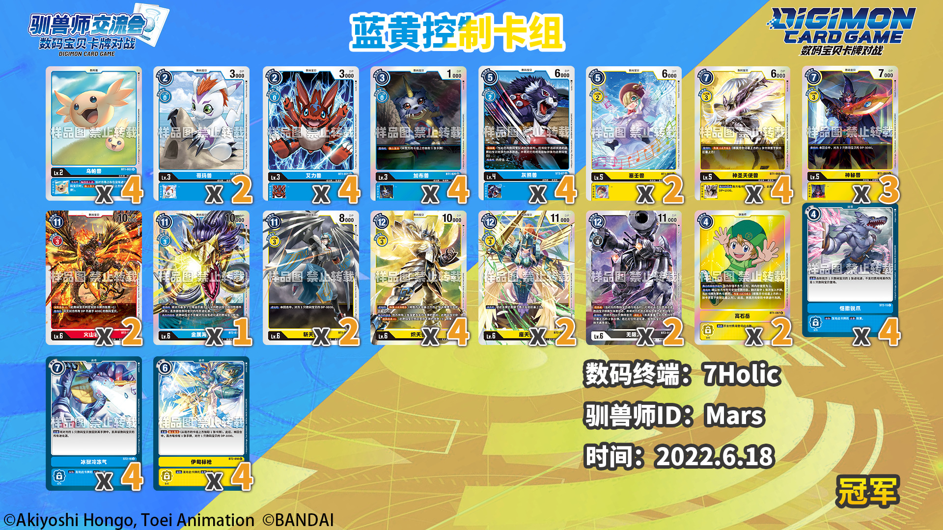 “Mars”选手使用蓝黄控制卡组在天津7Holic6月18日的17人比赛中夺得冠军,本次上位及冠军卡组类型分布统计中,仅统计到了1套该类型卡组,均属于其它板块。