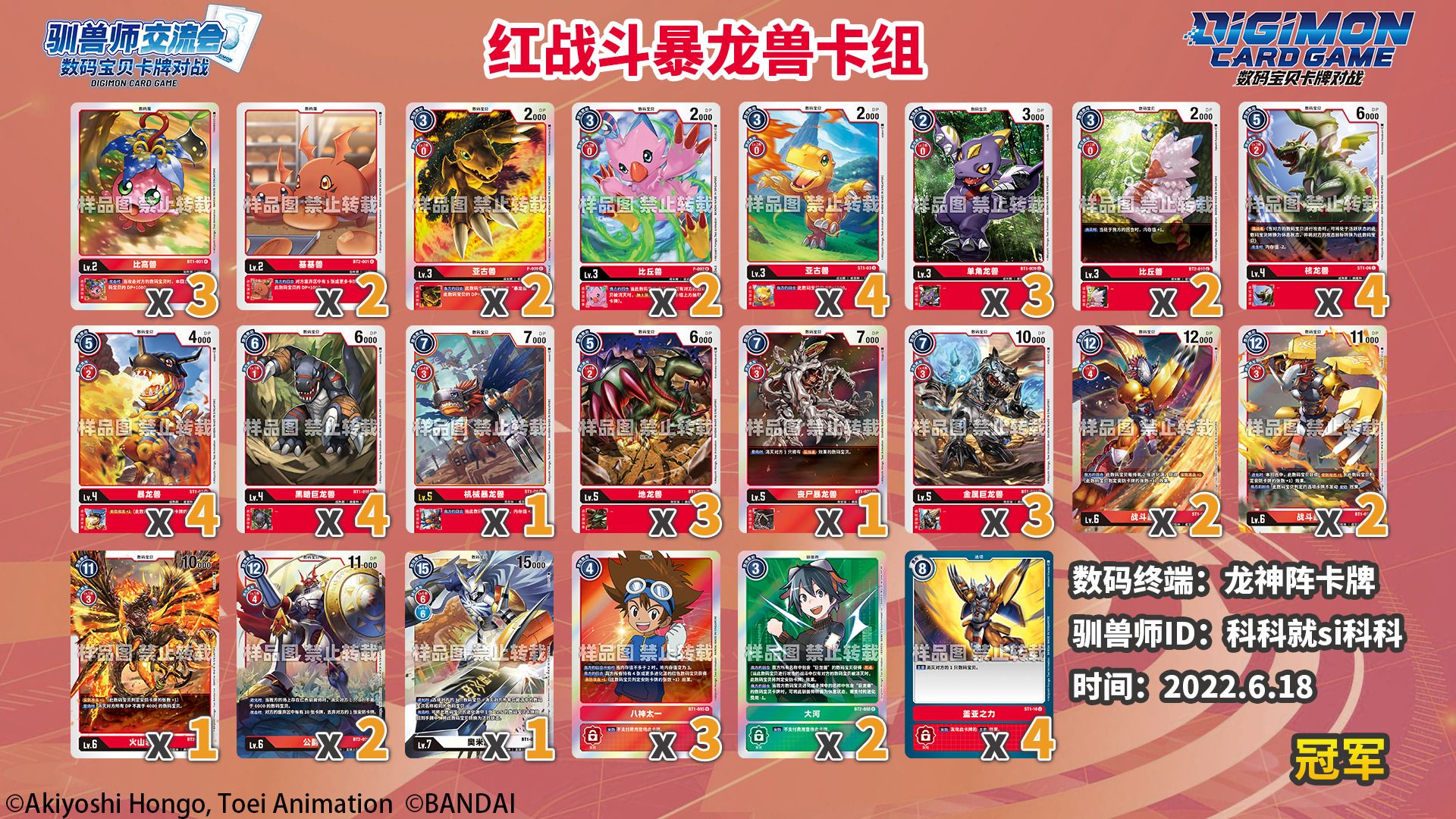 红色卡组的使用率在上周虽然略有减少,但仍有玩家在尝试不同的思路,并在比赛中取得了不错的成绩。与常见的红战斗暴龙兽卡组构筑不同,本套卡组意外地投入了“BT1-009 黑暗巨龙兽”“BT1-024 金属巨龙兽”“BT2-088 大河”等“巨龙兽”相关组件。通过“BT2-088 大河”的效果能让我方数码宝贝将要进化成名称中包含“巨龙兽”的数码宝贝卡牌时减少进化费用,从而达到快速进化的目的,同时大河还能给与我方所有名称中包含“巨龙兽”的数码宝贝《贯通》效果,能让自己的“巨龙兽”在消灭对手数码宝贝的同时,也能对对手的安防区造成伤害,在对战的前中期就能给对手带来不小的防守压力,若是能配合红色数码宝贝爽快的增加安防攻击及增加DP等优质的进化源效果,更是能快速拿下比赛的胜利。