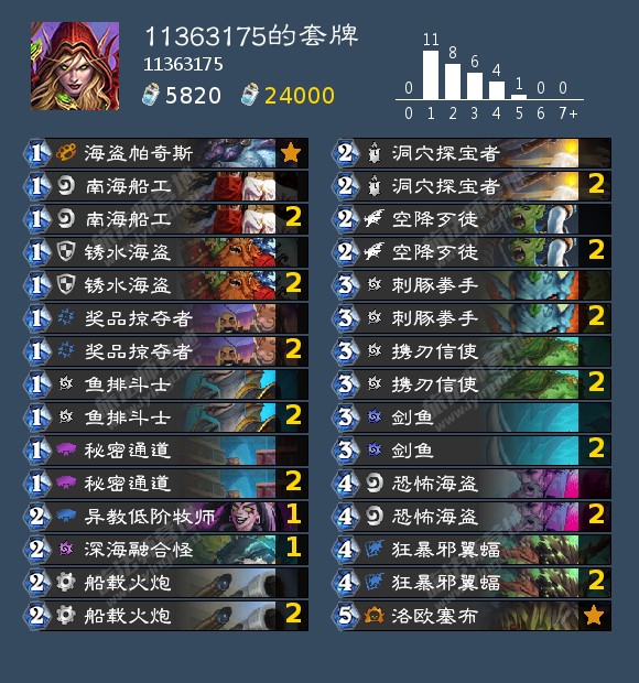 大家好,我是繁星|孜然汾沫,很高兴能够发文向大家推荐这套剑鱼贼构筑,这套卡组的模板是来自炉石西索的海盗贼,由于补丁后环境变动让我重新思考了一下卡组的部分单卡取舍,并用修改后的卡组打到了传说15名,虽然说不是很高,但卡组还是有一定的强度的。 这套卡组相比原先的构筑换掉了行骗、重拳先生和掩息海星,替换的卡分别是低阶牧师 洛欧塞布以及深海融合怪。 重拳这张牌受补丁的影响较大,由于加了一点费用导致出场回合会延后一个回合,携带的话容易卡在手上出不去所以舍弃。掩息海星这张牌在补丁前的表现非常出色,能够完美的突破德鲁伊的传播瘟疫,但由于补丁过后环境里的嘲讽怪变少,导致海星很容易卡在手上出不去所以舍弃。至于行骗,在索子哥构筑出海盗贼的时候争议一直都很大,定向抽行骗在剑鱼贼构筑中确实非常的强力,但是我觉得前期花费两费去抽一张行骗在当回合有些拖节奏,所以舍弃。 大小塞布的携带主要是为了克制在环境里增多的开门法 心火牧 shuilei贼 这类卡组 小赛布可以卡一手橡树召唤跟机械法的解读手机() 至于深海融合怪是替换行骗的卡位的,行骗有的时候的作用确实很大但经常卡在手上,所以选择能够补费用跟资源的深海融合怪,最重要的一点是他的海盗属性,能够提升海盗的纯度。 留牌方面的话就不细讲了,大家可以去看看索子哥的帖子。另外在告诉大家一个小技巧吧,在场上有325并且手上能出海盗的情况下,先砍一刀,因为可能抽空降歹徒(好几次都是因为这个伏笔一个怪) 以上就是我对剑鱼贼的一些心得体会了,由于本人玩炉石的时间比较短 只有不到两年,所以可能理解方面没有各位大佬深,希望大家能够在评论区指正错误 也欢迎大伙们在评论区友善讨论!