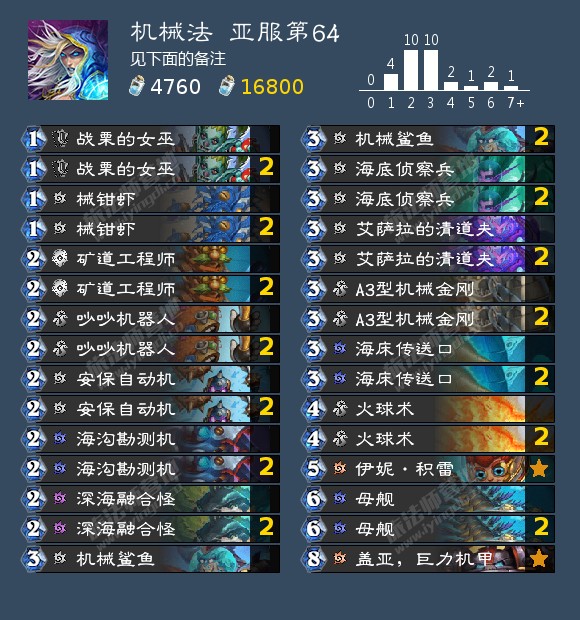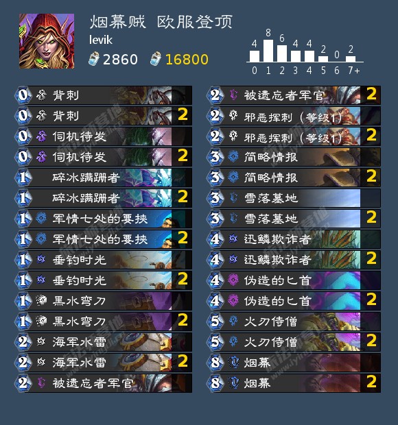 烟幕贼可以看作大奖贼的上限延伸版,拼的就是卡组上限。从构筑上来说,现有烟幕贼都会携带海军水 雷和火刃侍僧,而最值得考虑的问题就是第五个亡语怪带什么,目前看来一共有三种方案:暗影步、巨型猫头鹰和母舰。暗影步可以用来收迅鳞欺诈者引导爆发,在这套双迅鳞双烟幕的卡组中最重要的作用是提高暗影步的上手率、增强中期展开稳定性,在我看来是先手打天梯的最好选择;巨型猫头鹰的优势是伤害够高,但是和暗影步相比,它是亡语随从而非保障体系,因此会使得整套卡组比较拼胡,不过都选择烟幕贼了,这点不稳定性倒也无所谓?在我看来巨型猫头鹰适合牌风比较拼的玩家或者所在分段中抓**贼的战士比较多的玩家。至于母舰,我不是很推荐携带,因为标准机械池里有亡语……我自己的母舰就曾经出过冷饮制冰机,在看到伪造的匕首复制它的亡语的时候,我才更加深刻地明白了“拔剑四顾心茫然”的心境(bushi),更不消说还有我们的老朋友,母舰打假赛唯一指定搭档:自爆绵羊,在我看来这已经影响了卡组的运行逻辑。而且在我看来母舰并不能给卡组提供什么强力的上限,这两点是我觉得猫头鹰带来的不稳定性可以接受而母舰不可接受的原因。