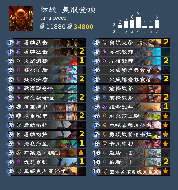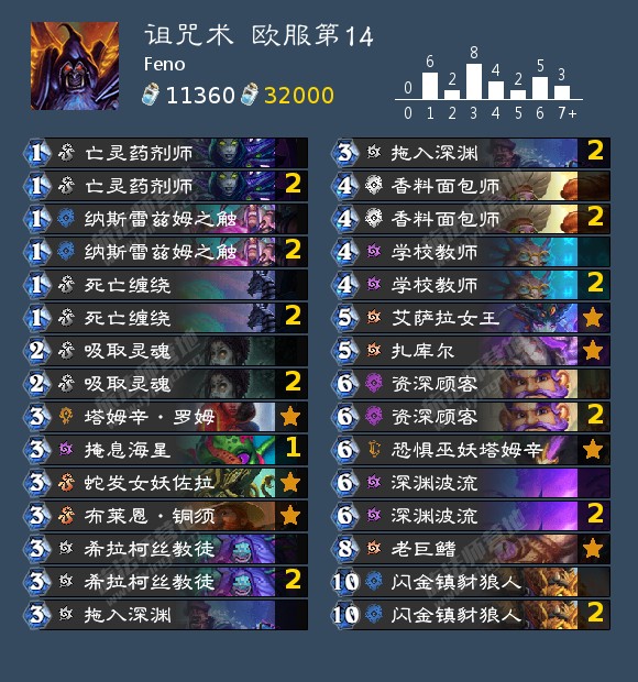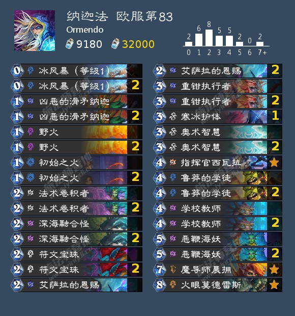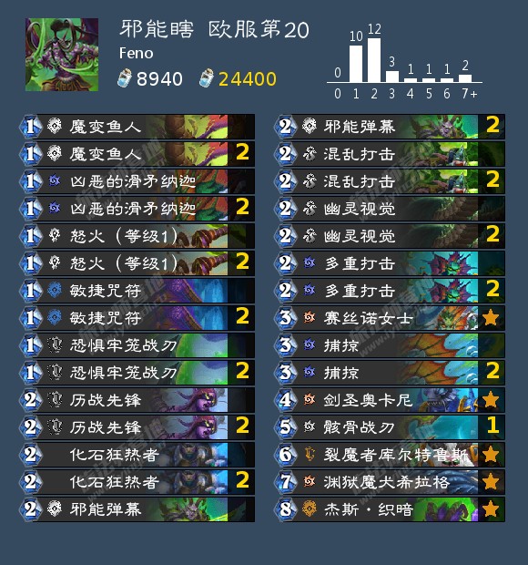 晓美焰的小攻略:有鱼群聚集手牌比较多,场攻够就可以考虑芬利去找嗜血;平时手里没用牌比较多也可以洗到牌库里去;比如自己血量比较危险了,手里七八张没变身可以7费芬利去找之类的;在对面手牌不太好解场的时候压个剑圣很容易配合场面下回合嗜血杀。他的这套卡组是抓**贼用的,厚度比较低。