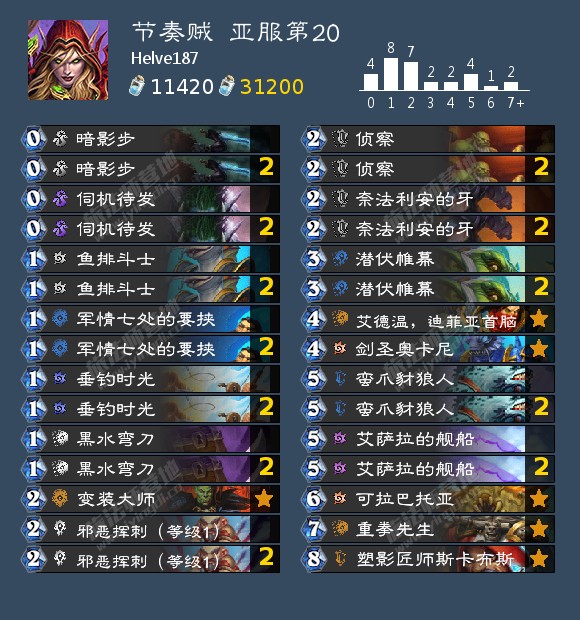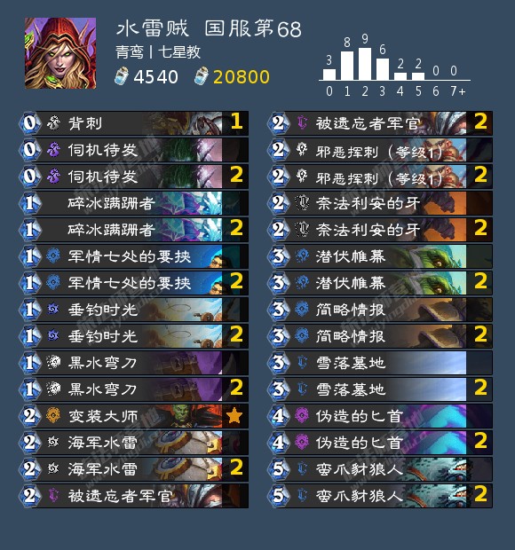 随着环境的演化和构筑的精进,水 雷贼成为了这个环境中最强的卡组之一。从构筑上来说,现在主流的水 雷贼放弃了艾德温,迪菲亚首脑或者海中向导芬利爵士,转而将这个卡位交给法术,常见的选择有背刺和偷师学艺两个,在我看来两者没有优劣之分,也是根据个人牌风进行选择。背刺是一个保下限的卡,最常用的场景是在碎冰蹒跚者不上手时刺掉自己的雷;偷师学艺则更看重上限,为的就是找到术士或者猎人的技能。此外国服还流行过不带变装大师的所谓“快攻水 雷贼”,但是这套卡组有两个问题:一是自己带了一堆莫名其妙的准时拍很强但是特别干扰帷幕而且只要不准时就屁用没有的随从;二是会让对面知道你是贼甚至很可能是**贼并据此进行留牌,与常规构筑相比最大的优势在于……不会触发简略情报破变装大师之后伪造的匕首可能复制变装大师的空气亡语的bug,进而显著降低被bug气到然后打开推特准备私信Iksar然后发现他关了私信然后气上加气无能之狂怒然后气大伤身的概率(bushi)。