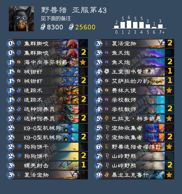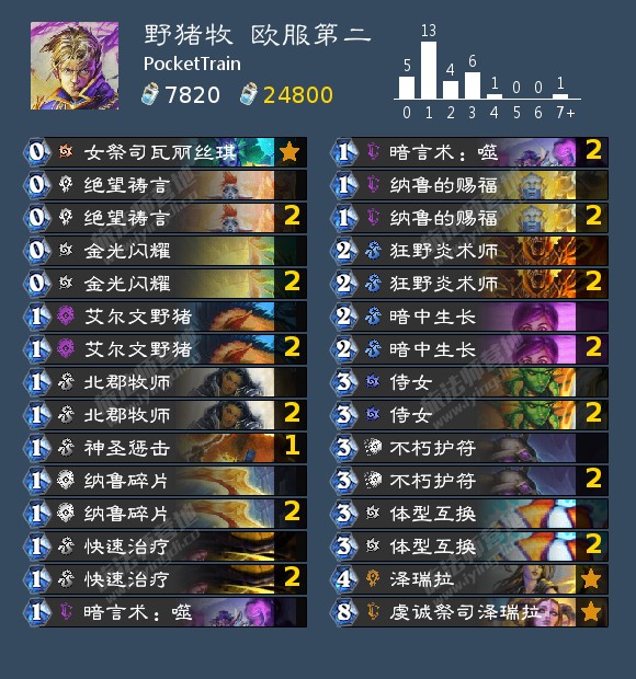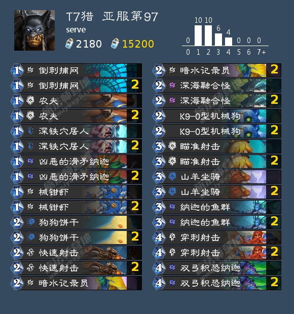 T7猎在补丁以后一度热度回升,但由于补伤害能力很差(或者说非常依赖双倍速加持)、前中期曲线也没那么满,还是很难成为主流卡组。