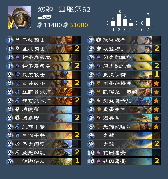 奶骑是当前环境中比较好的反快攻卡组,甚至单从反快攻的角度来说称得上是环境中这方面的翘楚,不过这个“翘楚”的地位多少有点矮子里拔高个的意味。自凤凰年以来,可以成为环境中T1甚至T0的控制卡组都有一个共同的特点:卡组节奏比较流畅、可以通过拍下随从进行场面交换,但是奶骑的中期节奏会有明显的断点,在游戏前期用闪光翻车鱼压住场面之后缺乏进一步的操作,下一个有用的随从可能就海兽号和光鳐,中间隔着好几个回合。而且奶骑的解场比较依赖combo,尤其是对于生而平等的需求非常强(不过它是神圣法术,可以抽/找),中期很容易解不动场然后积重难返。最后再讲一个打法上的问题,由于自身的削弱以及环境整体略有提速,我感觉奶骑现在起手不该留英雄了……
