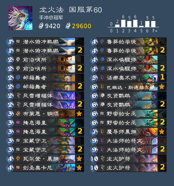龙火法的核心就是野蛮的女巫助推卡组展开,在广大玩家熟悉其运转逻辑之后,可以通过提前甩掉手牌中的法术进行克制,这也是这套卡组现在最大的问题,在我看来这其实无法避免。从构筑上说,目前龙火法都会携带邮箱舞者,这张卡对于龙火法有两个意义,首先是可以在空场的时候压场,2血在这个环境里没那么难解,但也没那么好解;第二是润滑卡组的中期节奏,毕竟龙火法在6费上的爆发点太多,而后续跟进的能用的牌就是9或者10了,某些卡组中携带的奔逃的魔刃豹也是为了润滑。在混回合的卡位里,同样也有潜水俯冲鹈鹕-前沿哨所-瓦尔登·晨拥和群羊体系两种流派,前者单打比较稳定,后者则比较讲究配——配合上了那就又有低费突袭又能芬利抽九张改变命运,配合不上就是不一定能看到残血的补刀怪、竞技场可能挺强的三四费突袭以及随机探底哥,具体作何选择可以根据牌风而定。