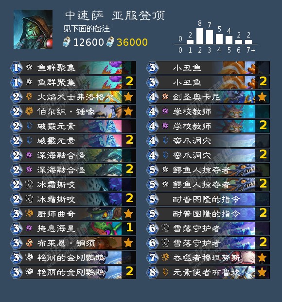 标准萨满现有的解牌质量其实很难支撑其进行慢打,很多时候就被迫转进到经典“雪落救救”环节,因此现在的萨满普遍在提速,“中速萨”终于愈发中速。中速萨引入的新玩具是火焰术士弗洛格尔,在实战中它可以配合小丑鱼打出爆炸AOE,有离谱者奥图里斯遗风。此外也有暴食巨鳗格拉格、嗜血等新玩具。