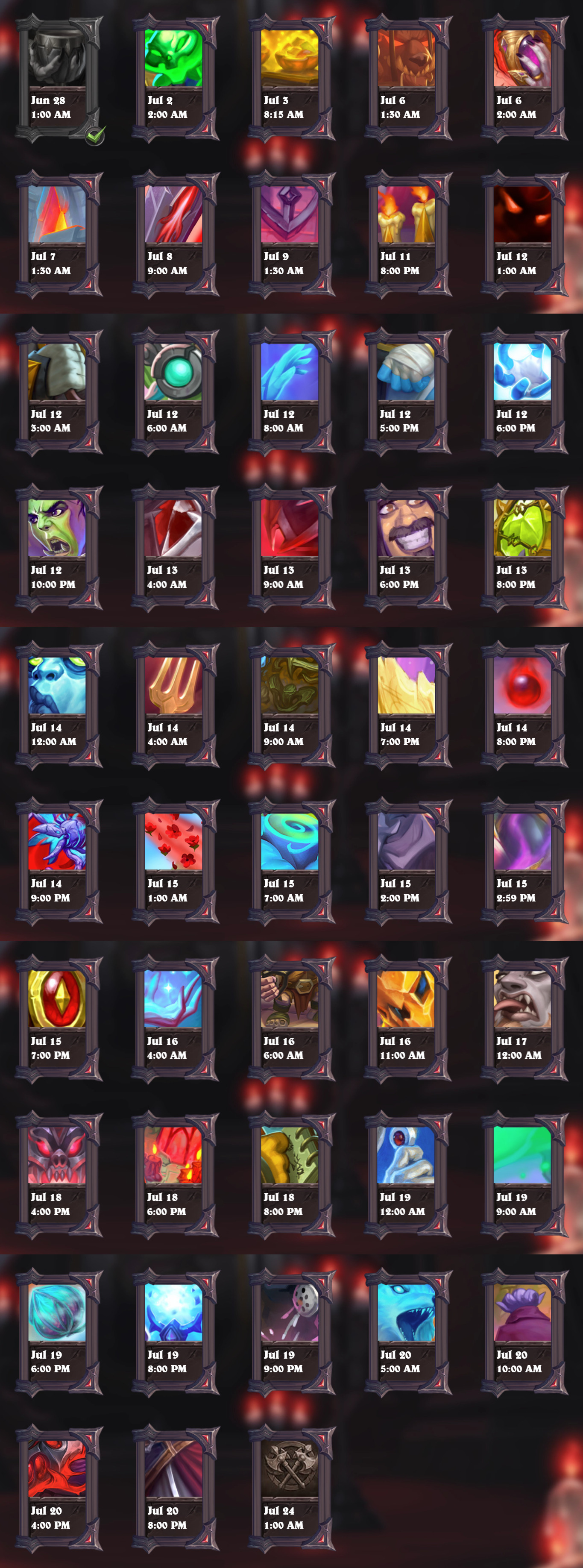 这次社区发布日程竟有三周左右,有所延长。日程一头一尾的两张也已有部分信息确定。第一张,也就是北京时间7月2日凌晨的这张,已经确认是在大师巡回赛瓦丝琪尔站的转播上公布;最后那张对决模式图标也已确认是(24.0补丁)对决新内容的预览,由炉石第一喷、常播对决的Zeddy发布。另外这次还有一场类似新卡发布会的直播,专门介绍地标牌玩法,同时也有新卡发布,时间是北京时间7月2日凌晨2点,嘉宾是概念组设计师Leo Robles和知名主播龙王。