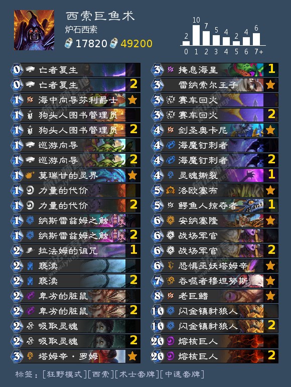 40血量和20血就能出红石头外加各种强力解场卡,就决定能乱杀所有快攻卡组,强力的鱼人体系外加安纳塞隆和豺狼人保证了前期场面的压迫力,超强的过牌能力保证资源源源不断,40张牌也很容易全部过到针对卡,剑圣和塞布等强力干扰卡稳固场面,海星可破战吼萨无限冰,拉法姆诅咒破法师冰箱,还拥有最强物理系斩杀风怒加力量代价,轻松斩杀40血以上。