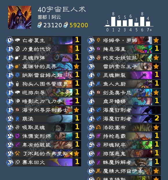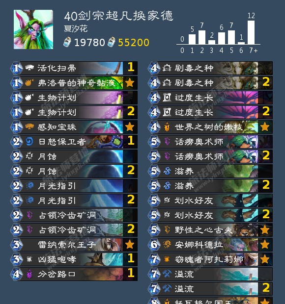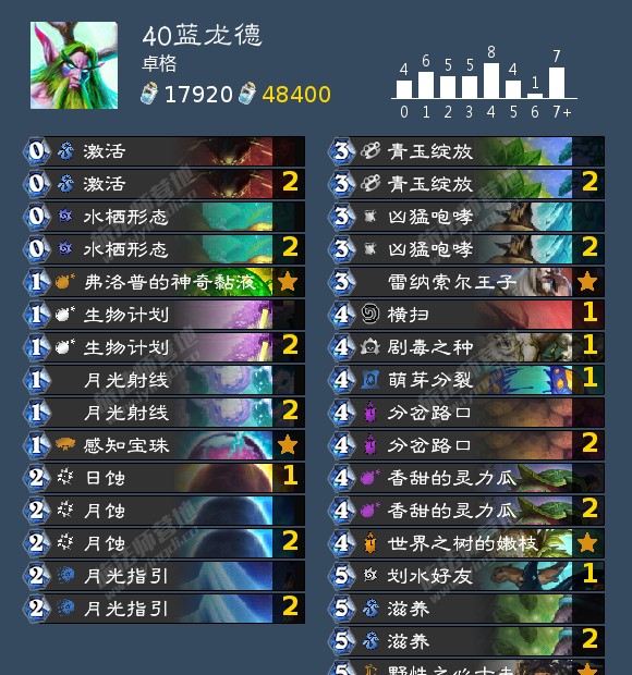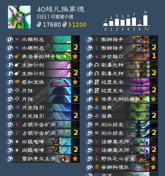 夏汐花的一套剑宗超凡换家德。40血上限让熔核巨人的出场变得更轻松,或许40卡组都可以考虑考虑。40血拉长战线后,我看到好多德鲁伊都选择满编话痨奥术师,同样玩德的老哥可以参考参考。