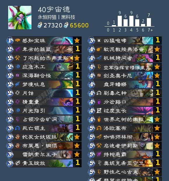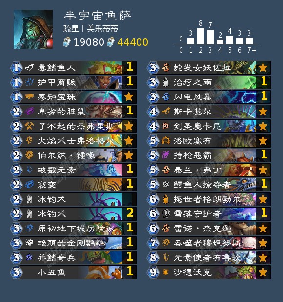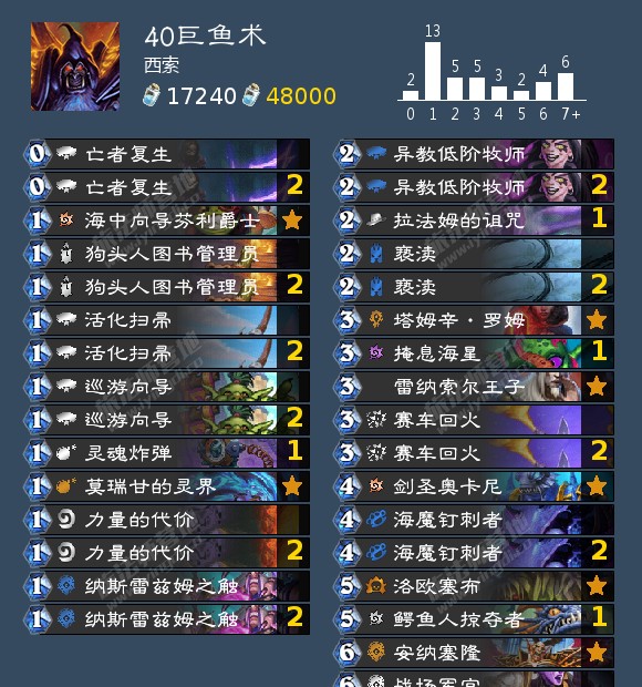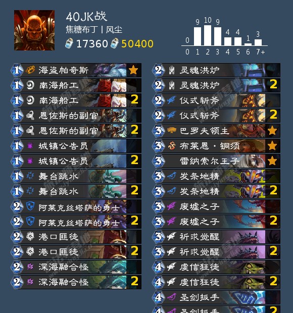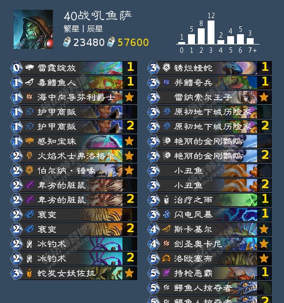 来自繁星丨辰星的40战吼鱼萨。他本身是一个战吼萨专精玩家,目前在国服前30,都是一套战吼萨全程不换打出来的,所以我觉得他的构筑有较高的可靠度。
