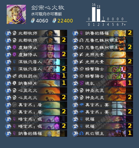 40形态的卡组,增加了血量上限,能更好地应对剑鱼贼这类直伤型快攻;但同时,稀释了解牌浓度,以场面为主的增强型(buff)快攻卡组反而发挥得更好。此处以水可载舟亦可赛艇老哥的剑宗心火牧为典例,他使用这套卡组在众多40卡组的包围下打进了月榜。