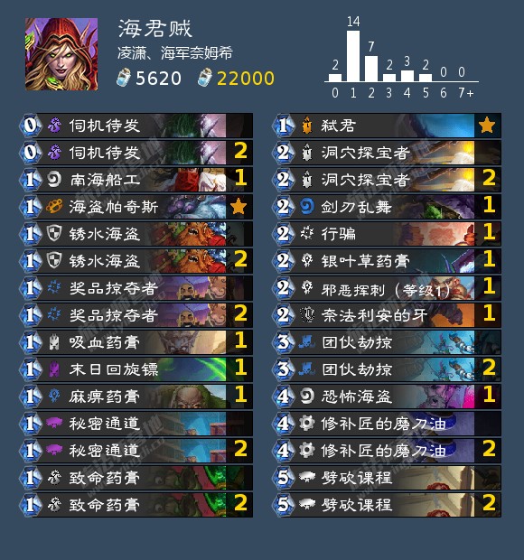 来自凌潇、海军奈姆希的海盗弑君贼,这套老卡组最近又复苏了,因为剑鱼贼的压迫,大家只会带低费软,根本没有黏指狗头人,不会再出现弑君被偷的难受情况了。