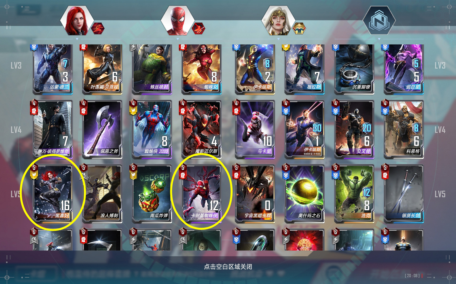 (1)、如果每回合能购买两个五费的黑寡妇,那么隐匿流的场上就有可能获得2-4个四星的黑寡妇,这可不是开玩笑的,直接把对方榨干了: