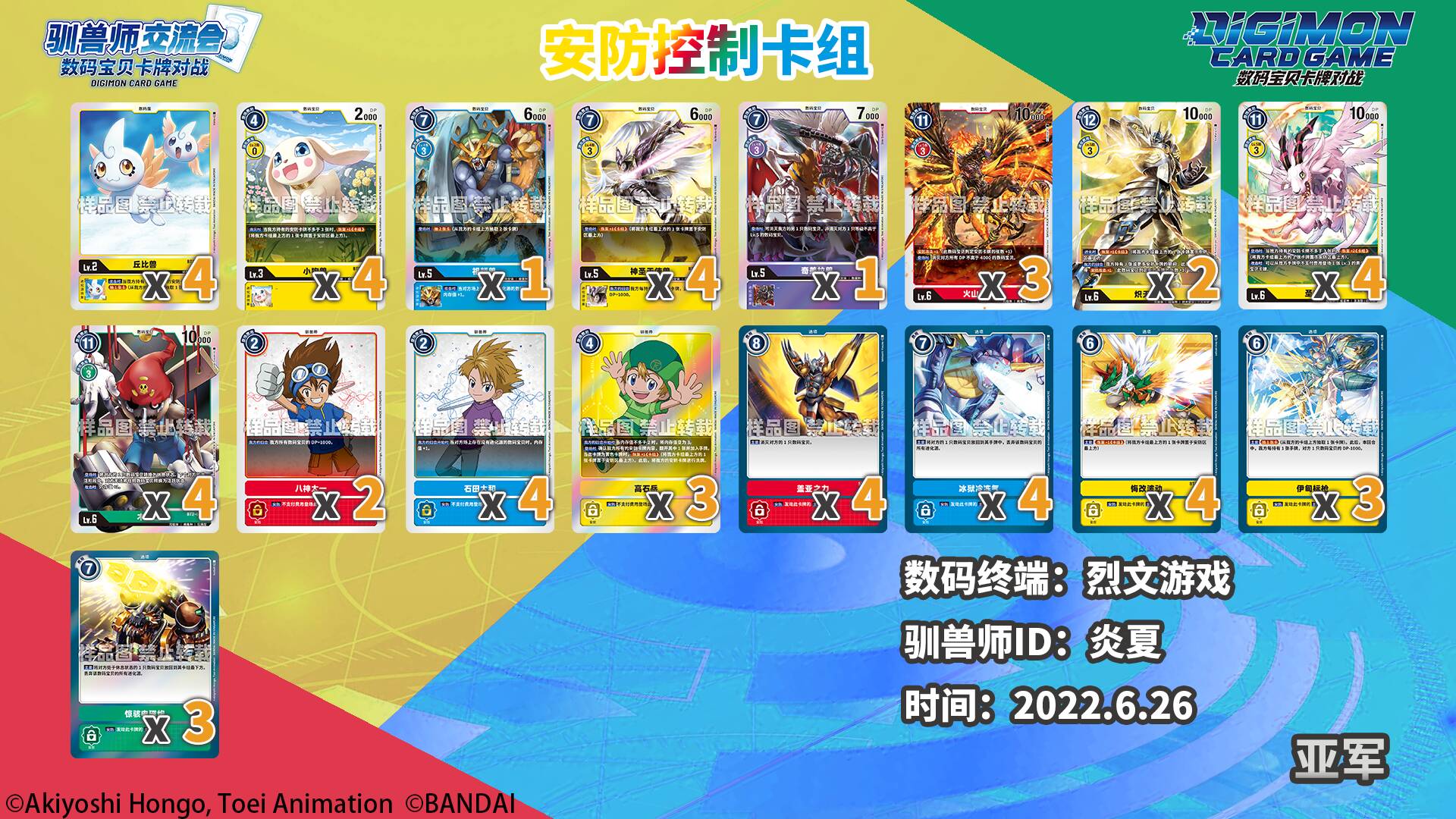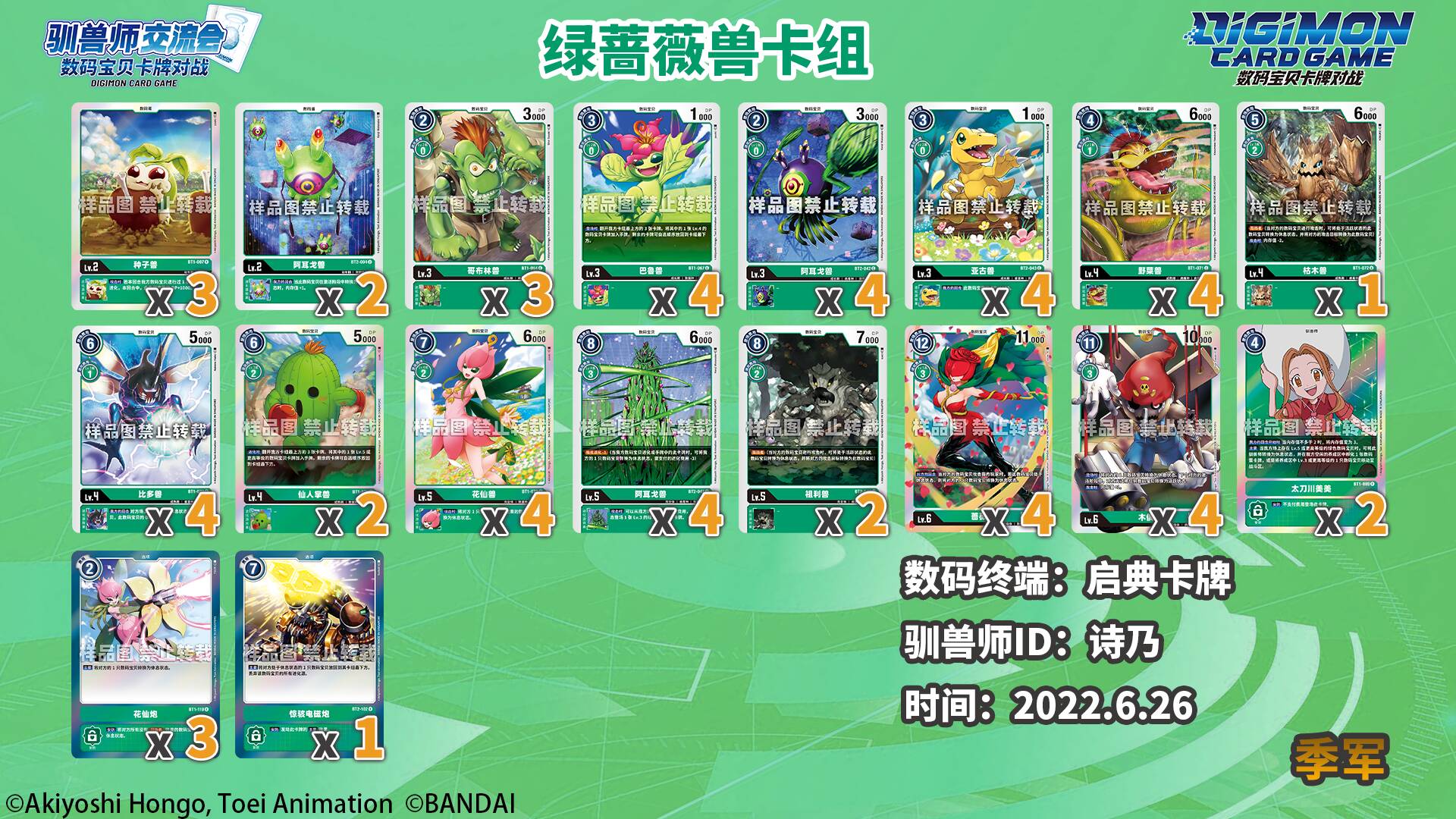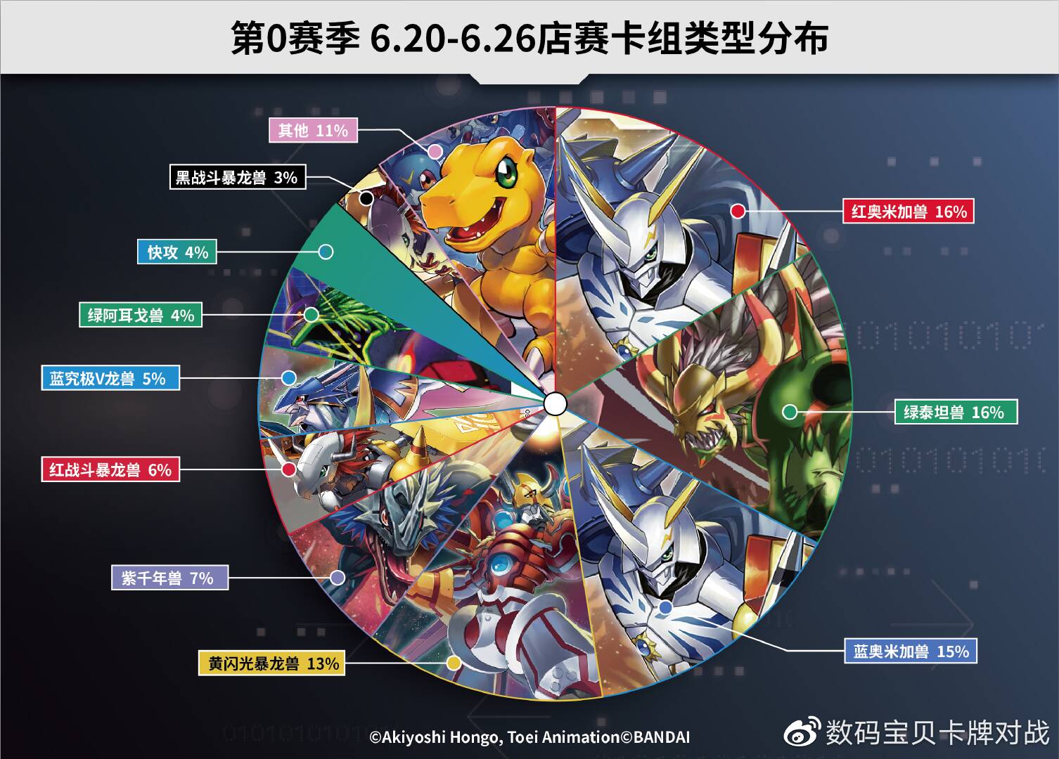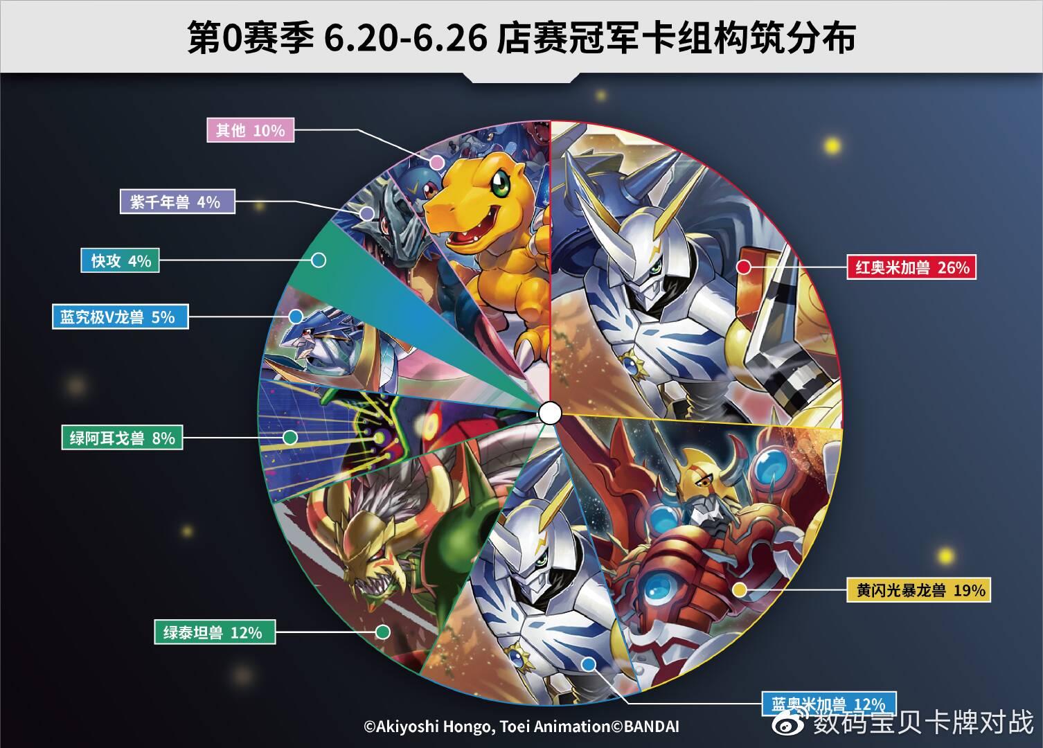感谢各数码终端和驯兽师们为我们提供的数据及卡组照片!以下数据仅供各位参考!因收到的卡组照片可能会有模糊不清的状况,展示的卡组可能与实际构筑有所出入。对本次统计如有疑问和建议欢迎以转发/评论/私信等方式联系我们!