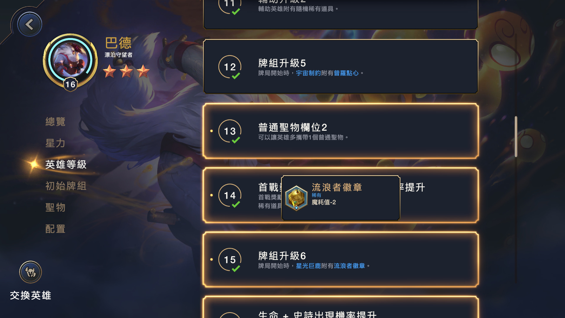 首先聊一下巴德,巴德B评级不变,巴德的核心道具是变色龙项链(开局往牌库洗两个复制),单变色龙项链就能大幅提高巴德的升级进度,两个变色龙强度直线提升,三个变色龙则无限逼近S级评价(尽管我也遇到过3变色龙牌库里20张牌80个编钟,7费巴德没升级的尴尬情况),我这次打了两把巴德的素材,都是单变色龙,一次12级一次15级,巴德15级会给星光神鹿带流浪者徽章,555咒盾碾压一下子减了两费,对于前期节奏、致胜进度都是极大提升,3费的大哥开场留也不会有卡手的风险,所以建议巴德练到15级及三星开打加里奥以获得最佳体验。