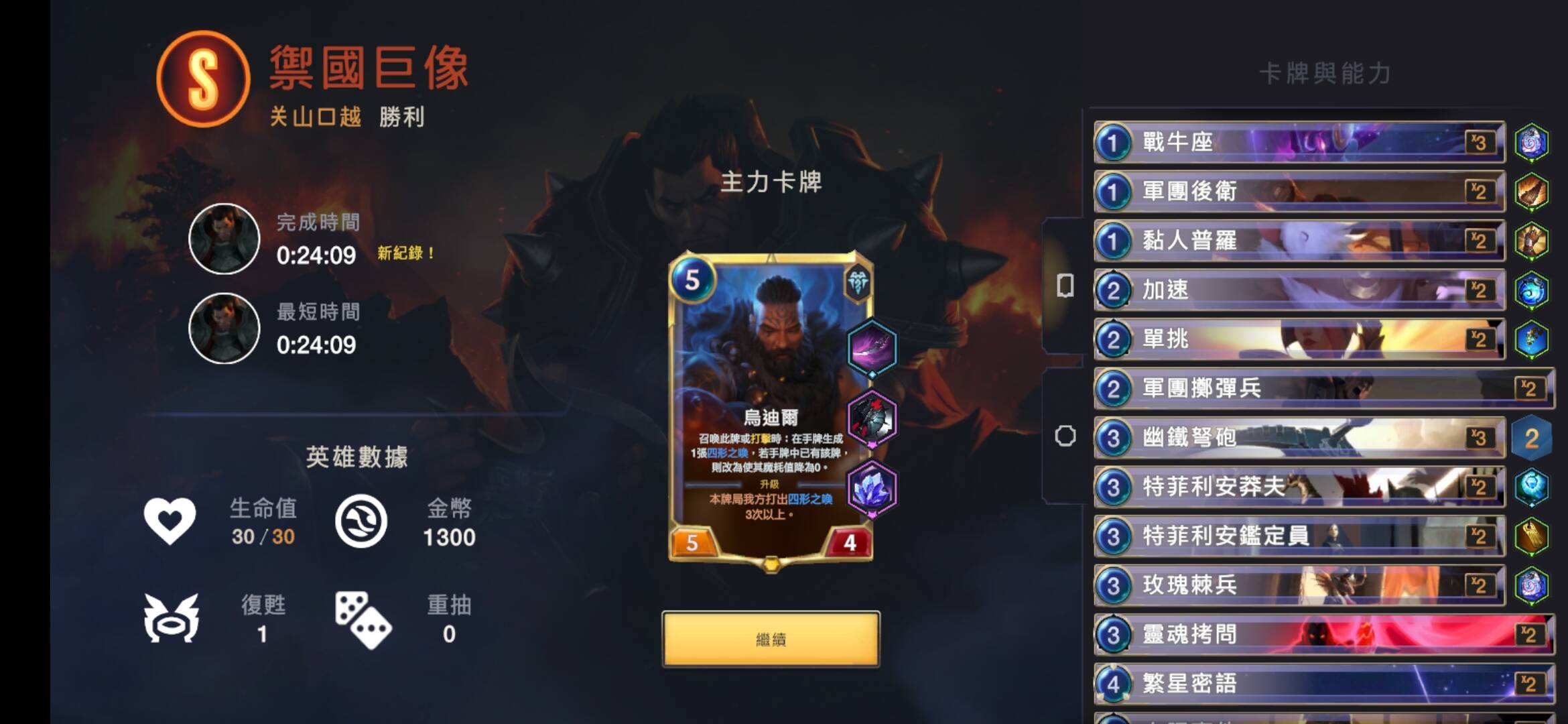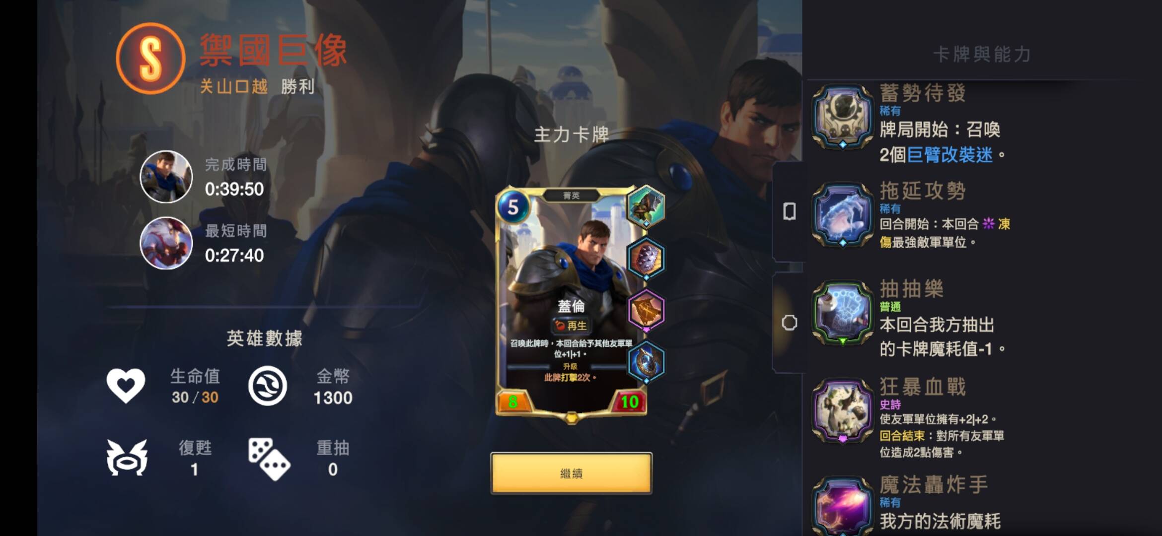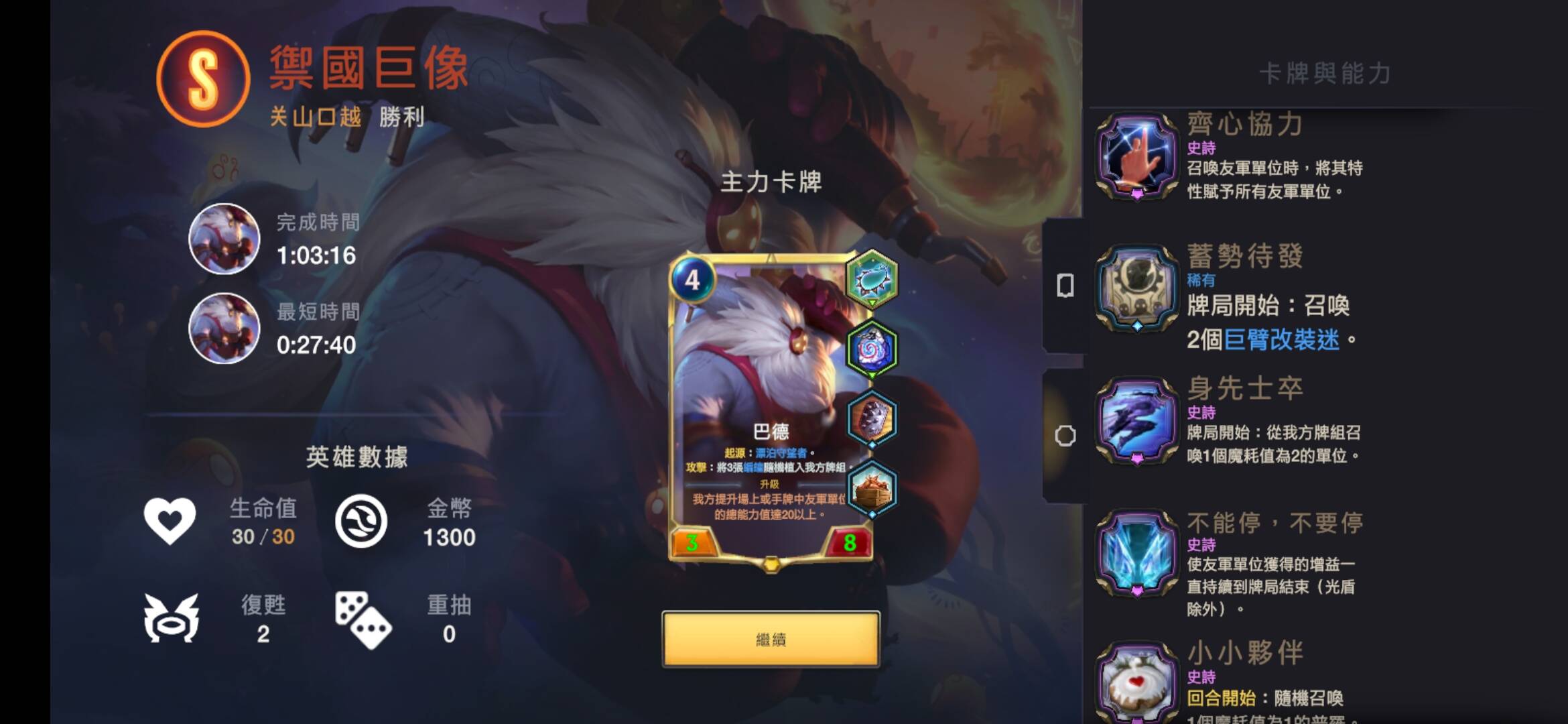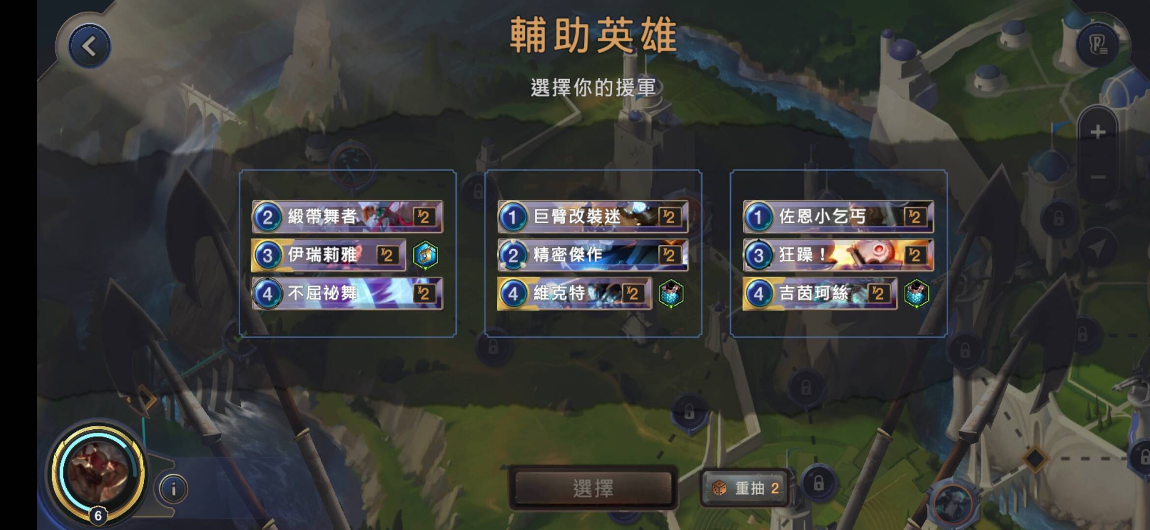 盖伦重评级B+到A-,自带的打击加身材在加里奥关卡的发挥并不特别出色,但每回合给的单挑可以辅助解决佐伊等强力威胁,由于必须提高对单挑的利用率,天赋优先选择法术轰炸手、巫术、征服,甚至天马行空、战痕(受伤不死+1+1)、召唤俩11扩增都是可以选的。盖伦绿色道具可以选择碾压、鬼索,蓝色道具有条件的情况下选择入场打击单位/脸皆可,这样盖伦入场66身材,下场回合即可升级,升级后可以提供至少一次稳定备战,收益较高。盖伦属于补丁躺*的对象,232变成了221基本失去了单体交换能力,容易在前期被抢血。剔除卡牌推荐433、没结附抽1的221(因为钩子鸟自带快速攻击,对光盾的要求降低)