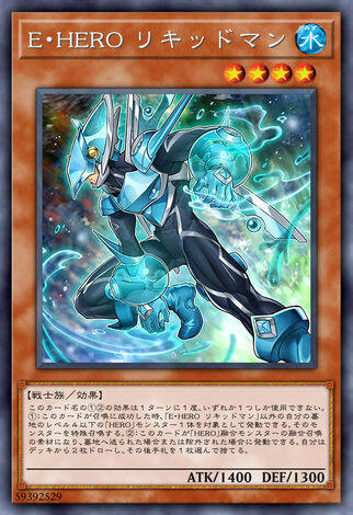 效果: 这个卡名的①②的效果1回合只能有1次使用其中任意1个。 ①:这张卡召唤成功时,以「元素-英雄 液态侠」以外的自己墓地1只4星以下的「-英雄」怪兽为对象才能发动。那只怪兽特殊召唤。 ②:这张卡成为「-英雄」融合怪兽的融合召唤的素材,被送去墓地的场合或者被除外的场合才能发动。自己从卡组抽2张,那之后选1张手卡丢弃。