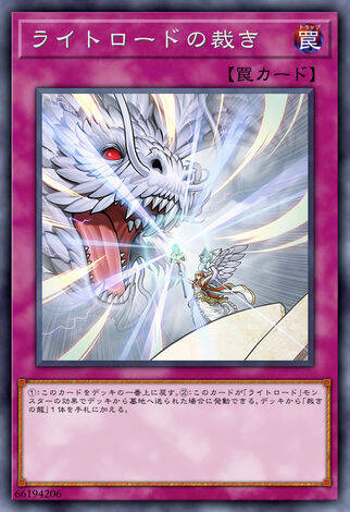 ①:这张卡回到卡组最上面。 ②:这张卡被「光道」怪兽的效果从卡组送去墓地的场合才能发动。从卡组把1只「裁决之龙」加入手卡。