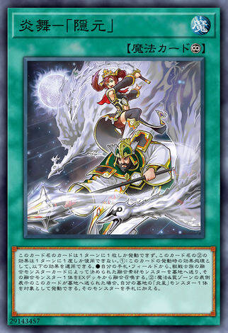 这个卡名的①②的效果1回合各能使用1次。 ①:这张卡特殊召唤成功的场合才能发动。给与对方为自己场上的「炎舞」魔法·陷阱卡数量×200伤害。 ②:自己·对方的战斗阶段,把自己场上1张表侧表示的「炎舞」魔法·陷阱卡送去墓地,以对方场上1张卡为对象才能发动。那张卡破坏。