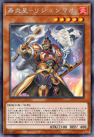 这个卡名的①②的效果1回合各能使用1次。 ①:自己把「炎舞」魔法·陷阱卡发动的场合才能发动。这张卡从手卡特殊召唤。那之后,可以从自己墓地选「寿炎星-李熊猫」以外的1只「炎星」怪兽特殊召唤。这个效果的发动后,直到回合结束时自己不是「炎星」怪兽不能特殊召唤。 ②:自己场上的「炎星」怪兽被对方的效果破坏的场合,可以作为代替把自己场上1张表侧表示的「炎舞」魔法·陷阱卡送去墓地。