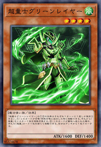 ①:没有超量素材的这张卡不能攻击。②:1回合1次,把这张卡1个超量素材取除,以这张卡以外的场上1只表侧表示怪兽为对象才能发动。那只怪兽变成里侧守备表示。这张卡有「超级量子战士 绿光层」在作为超量素材的场合,这个效果在对方回合也能发动。③:1回合1次,自己主要阶段才能发动。选自己的手卡·场上1只「 超级量子战士 」怪兽在这张卡下面重叠作为超量素材。